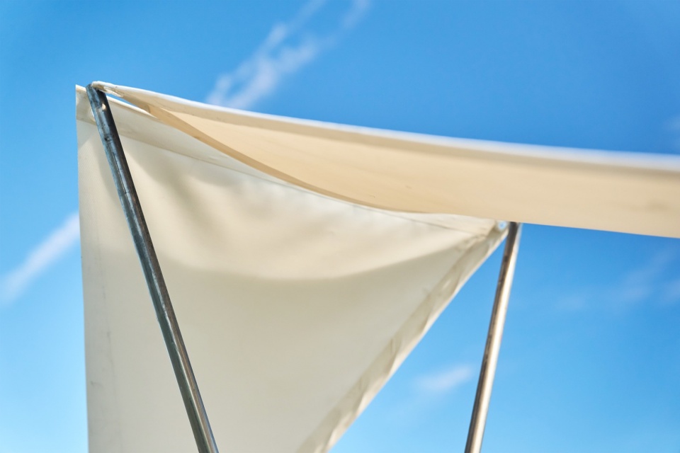 The light, floating textile roof introduces a second layer of interpretation: that of shade and atmosphere. The fabrics stretched between the porticoes create a play of light and shadow that evokes the rhythms of cultivation, seasonal protections, and the daily care of the land. It is not a functional roof, but a symbolic one: an evocation of labor, shelter, and the long, unhurried rhythms of the agricultural landscape.