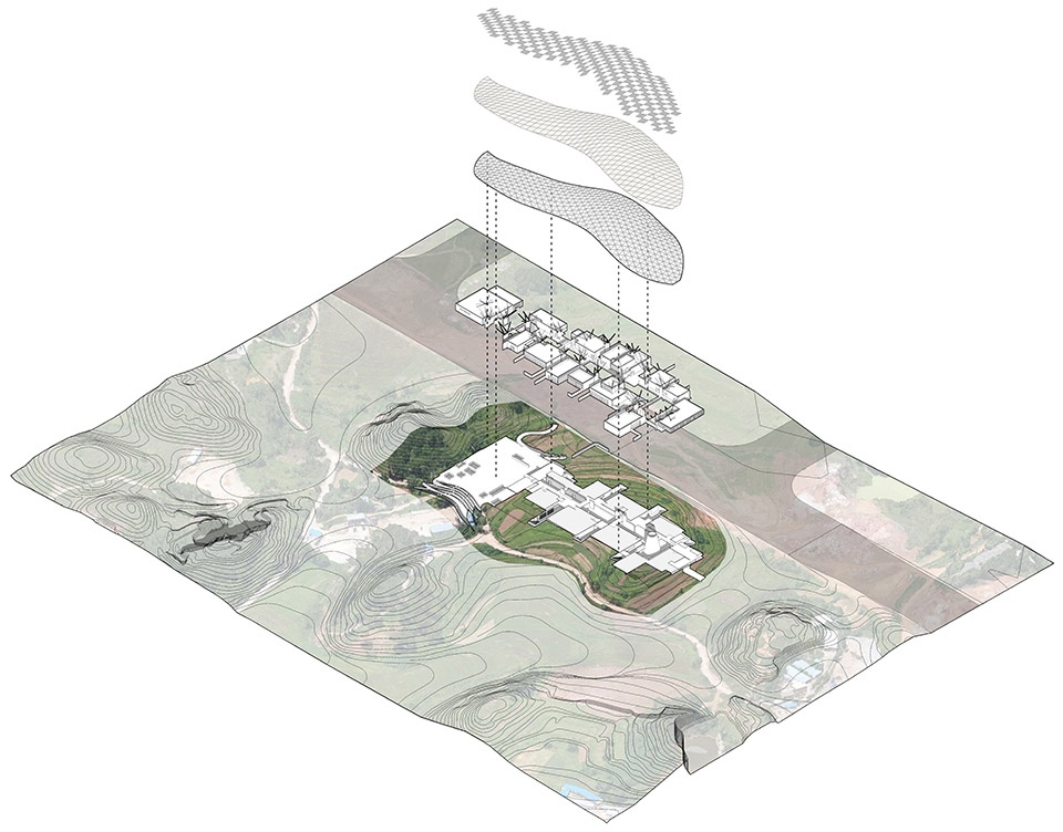 ▼流线型的“天幕”覆于聚落之上