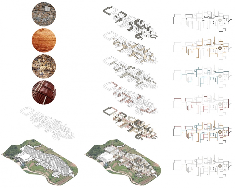 As a building in landscape, natural and local materials were used as many as possible. The design celebrates vernacular architectural materials such as rammed earth, rubble, wood, and tile, while reusing rescued materials on the site for new constructions. For instance, crushed stones and red clay were collected and used in the construction of the facades of the main building. These materials have sound and thermal insulation performance which help improve the comfort of buildings.