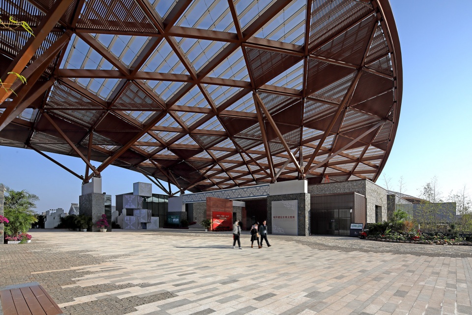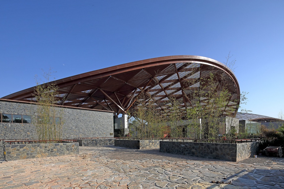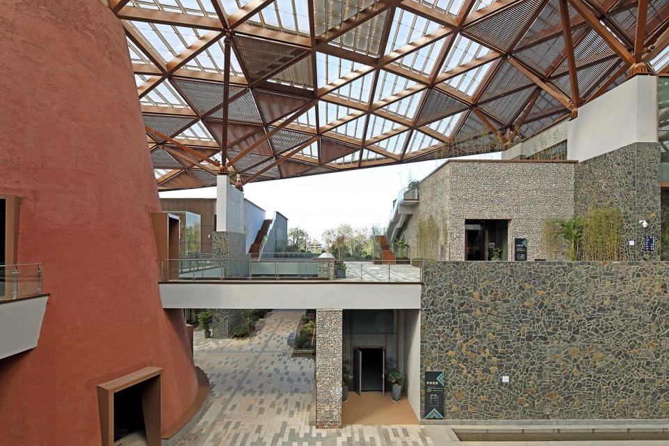 A huge steel-structured roof was designed to echo the natural landscape, acting as a shading system covering the clusters and integrating the buildings into nature. Considering the local climatic conditions, an internal street was designed under the roof as the transition space between the indoor and outdoor spaces, connecting the exhibition clusters and providing relaxing places. Sunlight and natural ventilation is introduced to create a comfortable environment for the activities.