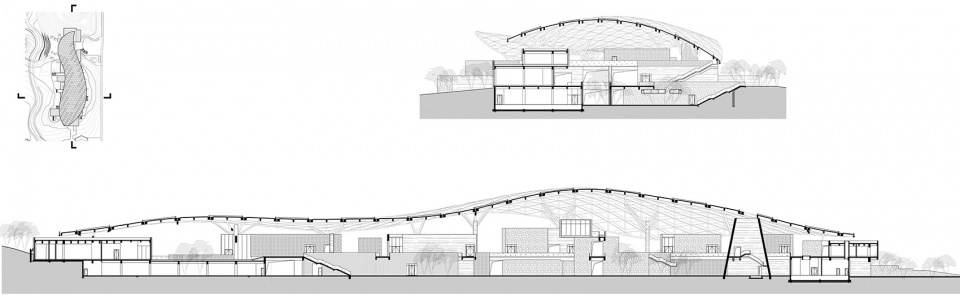 遮阳避雨的钢结构“天幕”覆于聚落之上,延续山形走势,使建筑融入环境。结合当地气候条件,将联通展厅的内街与休息空间设置在屋盖下的巨大灰空间中,为参观者提供自然风与日光,创造舒适的室外观览环境。