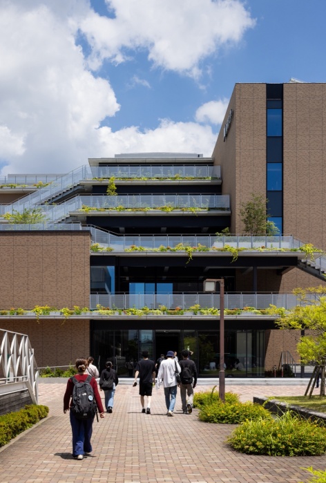 To incorporate the vibrancy of the existing Campus Plaza (courtyard) — the heart of student activity — into the new building, a terraced space with stepped setbacks was created. With its abundant plantings, benches and tables tailored for student use, it creates a pleasant, healthy space where students can linger, feel the greenery and breeze, and enjoy distant views of the Osaka Plain from the top floor.