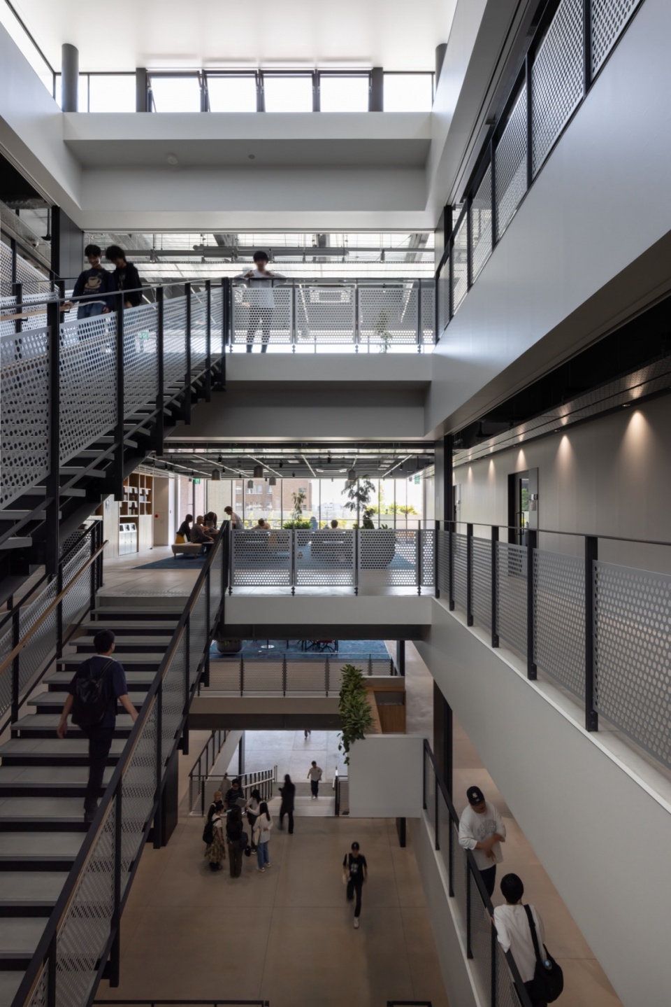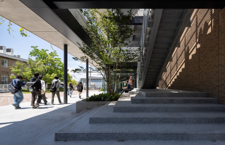 The Campus Plaza courtyard facing the site, functions as the central hub where students gather between classes and during lunchtime. To seamlessly draw student activity from the courtyard, set back, stepped terraced spaces were created from the courtyard side. The terraced building volume emerged as a rational response to planning restrictions arising from the northern road, which is narrow in parts. Leveraging this stepped design, rich plantings, benches, and tables were incorporated, creating comfortable spaces for students.