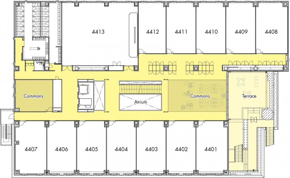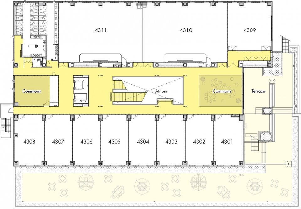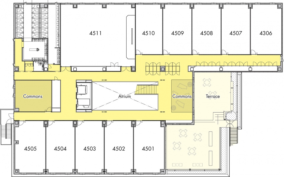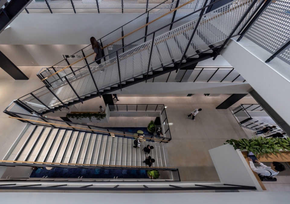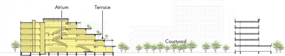 The central staircase atrium serves as the building’s core, and the main circulation route for students. Spaces surrounding the stairs function as gathering spots, and are designed to encourage student movement between classes, fostering chance encounters and interaction. Open common areas are positioned on each floor, facing the west-side terraces. These spaces are designed to be comfortable and seamlessly connect to the terraces, allowing student activities to naturally extend from the common areas to the terraces, creating a lively atmosphere throughout the entire building.