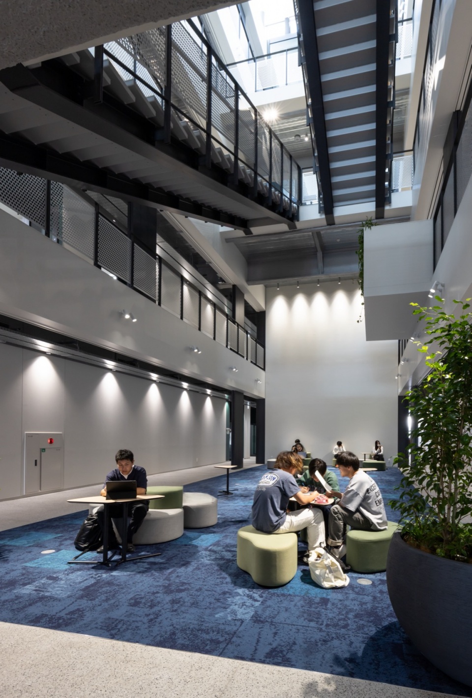 The prior Building 4 had few openings facing the courtyard, resulting in a layout that did not fully utilize the courtyard’s spatial value or foster a sense of connection with it. The replacement facility was therefore designed with an open, continuous building form that faces the courtyard. By planning it as an integral part of the courtyard, the design creates a space for learning and interaction where communication and activities can occur naturally. This encourages students to actively use the building and gather there, even outside of class hours.