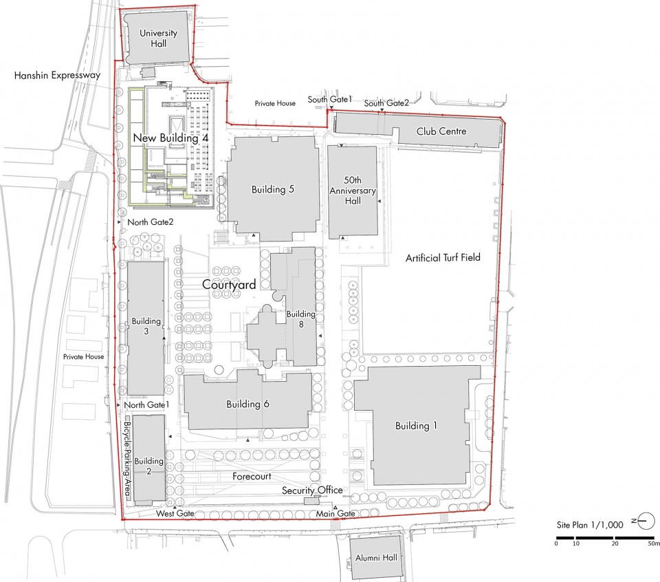 阪南大学位于大阪中心以南郁郁葱葱的大和川沿岸地区,于2025年迎来建校60周年,是一所拥有悠久历史和传统文化的文科私立大学。为了迎接这个具有里程碑意义的年份,大学在重组学部的同时,还推进了校园建设工作,旨在将位于其他地块的南校区整合到本次用地的主校区。以学部重组和南校区整合为契机规划的新4号楼,不仅是对老旧校舍的重建,更是主校区规模最大的新教学楼,用以应对学生数量的增加。旧4号楼因面向中庭的开口较少,导致与中庭的联动性不足,未能充分利用其空间价值。因此,新4号楼采用了面向中庭开放且具有连续性的建筑形态。通过与中庭的一体化规划,让学生们在课余时间也能积极利用大楼、聚集于此,从而实现了能够自然产生交流与活动的学习交流空间。