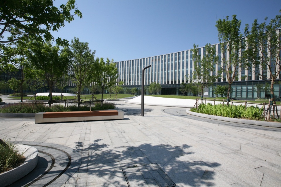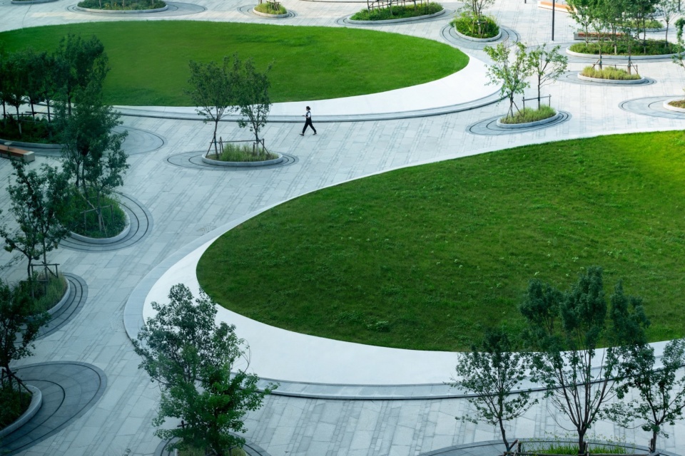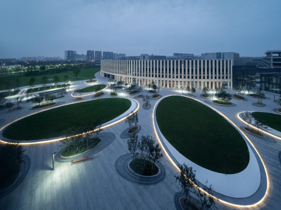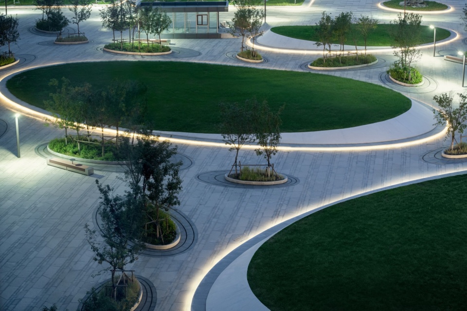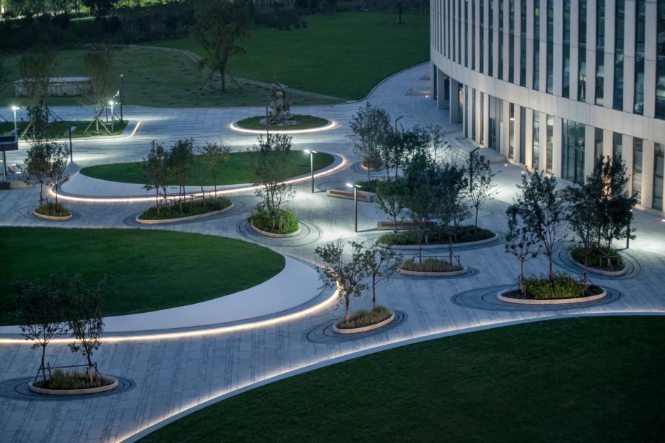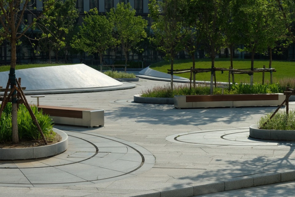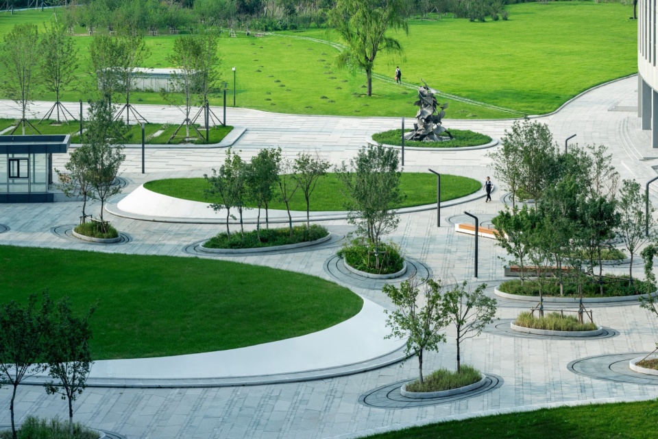 The Garden of Growth is located in the outdoor inner courtyard enclosed by two arc-shaped building clusters in the western half of the park. Referred to as a “courtyard,” its actual scale is significantly larger than that of a conventional courtyard. A west–east entrance road axis further divides the space into two symmetrical parts—north and south—with the northern section developed first. As the scale of the arc-shaped buildings on the east and west sides is well proportioned to the width of the inner courtyard, we extended the curved geometry of the building façades directly into the design elements of the landscape.