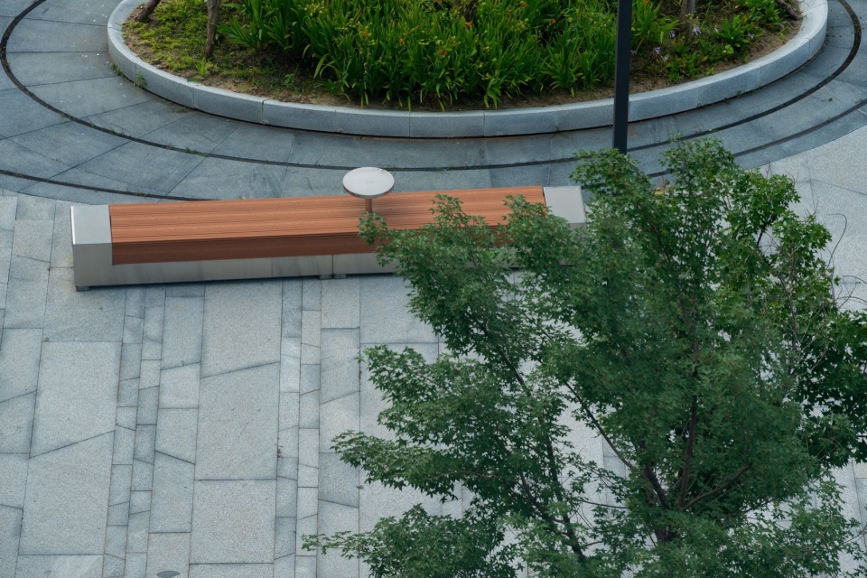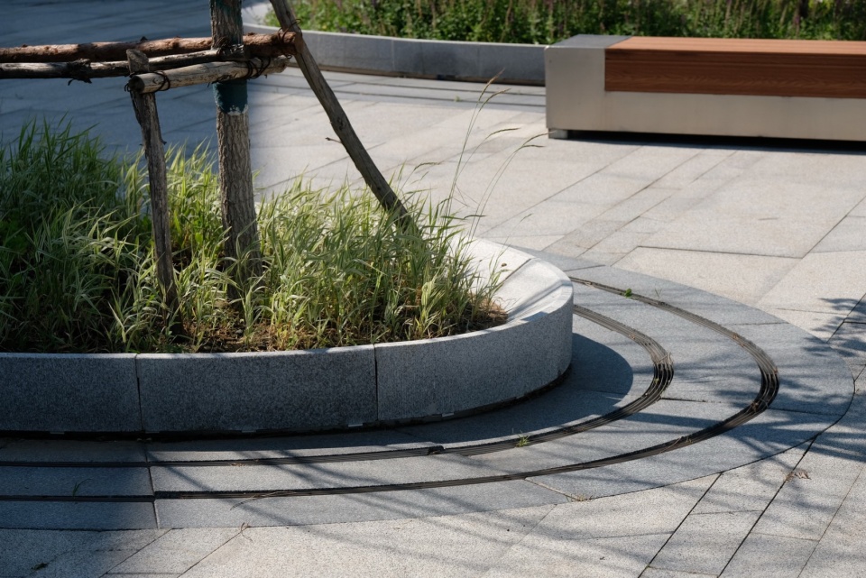 Secondly, the elliptical tree pools scattered throughout the site adopt the traditional shape of Chinese sycees, with surrounding pavements designed in a gradually outward-expanding elliptical form, allowing the curved lines of the layout to blend naturally into the site. All vegetation is clearly delineated, ensuring maximum spatial control while also making the tree pools an integral part of the spatial form. Additionally, the site uses relatively small-scale stone paving to avoid high costs associated with complex shapes, creating a large-scale effect of simple overall design with intricate local variations.