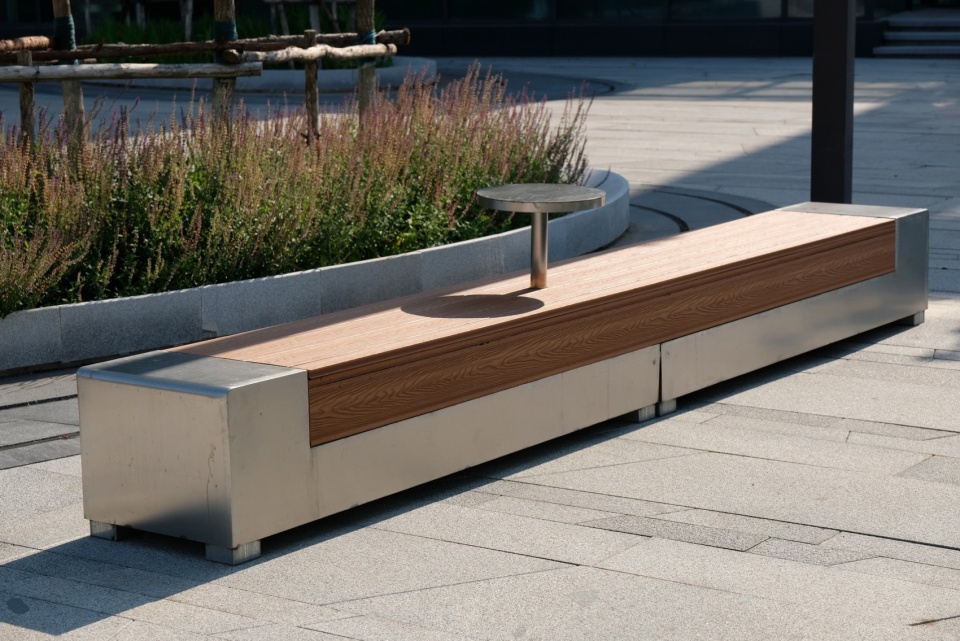 Finally, long, prefabricated benches are installed, each equipped with a symbolic round tabletop, providing a sense of homely belonging and a free, relaxed atmosphere for the researchers working here. Sometimes, evoking scenes from daily life for the users is particularly important.
