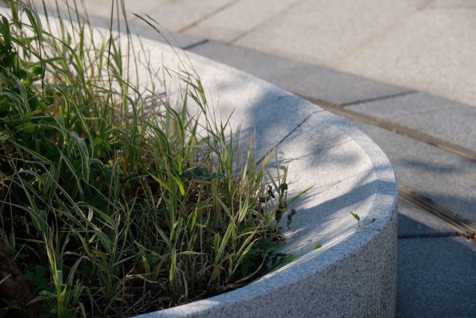 其次,分布在其间的椭圆形树池采用传统元宝造型,并将周边的铺装也做成渐渐向外扩散的椭圆形,让平面构成的弧线更自然的融入场地之中。在这里所有的植被都被明确的界定,最大限度的确保空间构成的可控性,同时也让树池成为空间造型的一部分。此外,场地铺装采用相对小尺度的石材拼装,尽可能的回避因造型加工而出现的高额造价,营造整体单一局部变化而略显繁琐的大小组合的大效果。