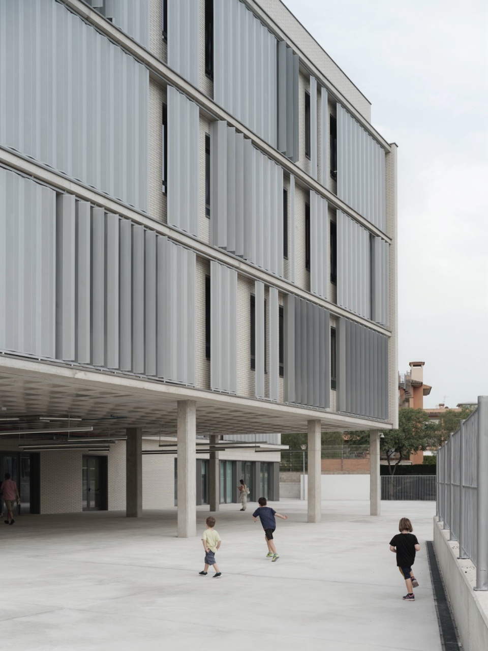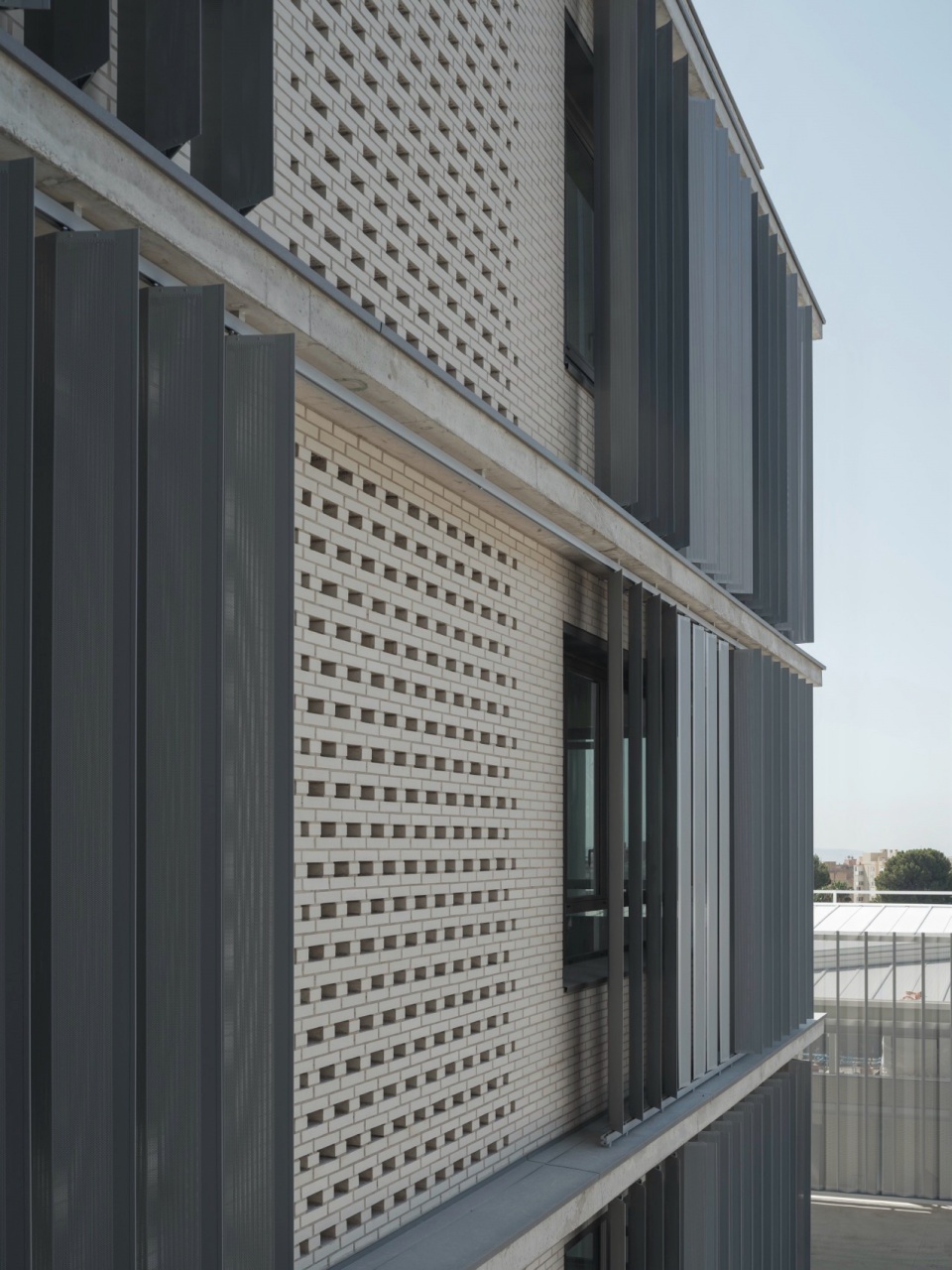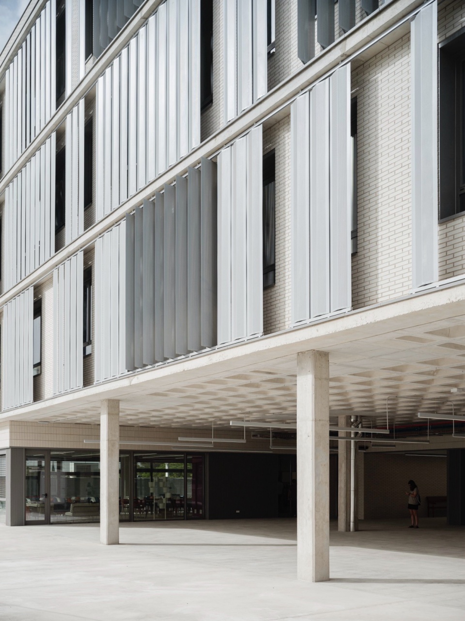 Through a skin of steel louvers, the building’s façade responds to the lighting and ventilation needs of the classrooms. This skin adapts to different orientations, optimizing interior comfort conditions based on solar exposure and classroom use. The modulation of the slats gives the façade a dynamic and visually interesting character, varying according to the orientation of the building and adapting to the lighting needs throughout the day. The chromatic variation of the slats enhances this diversity and visually lightens the compact mass of the building.