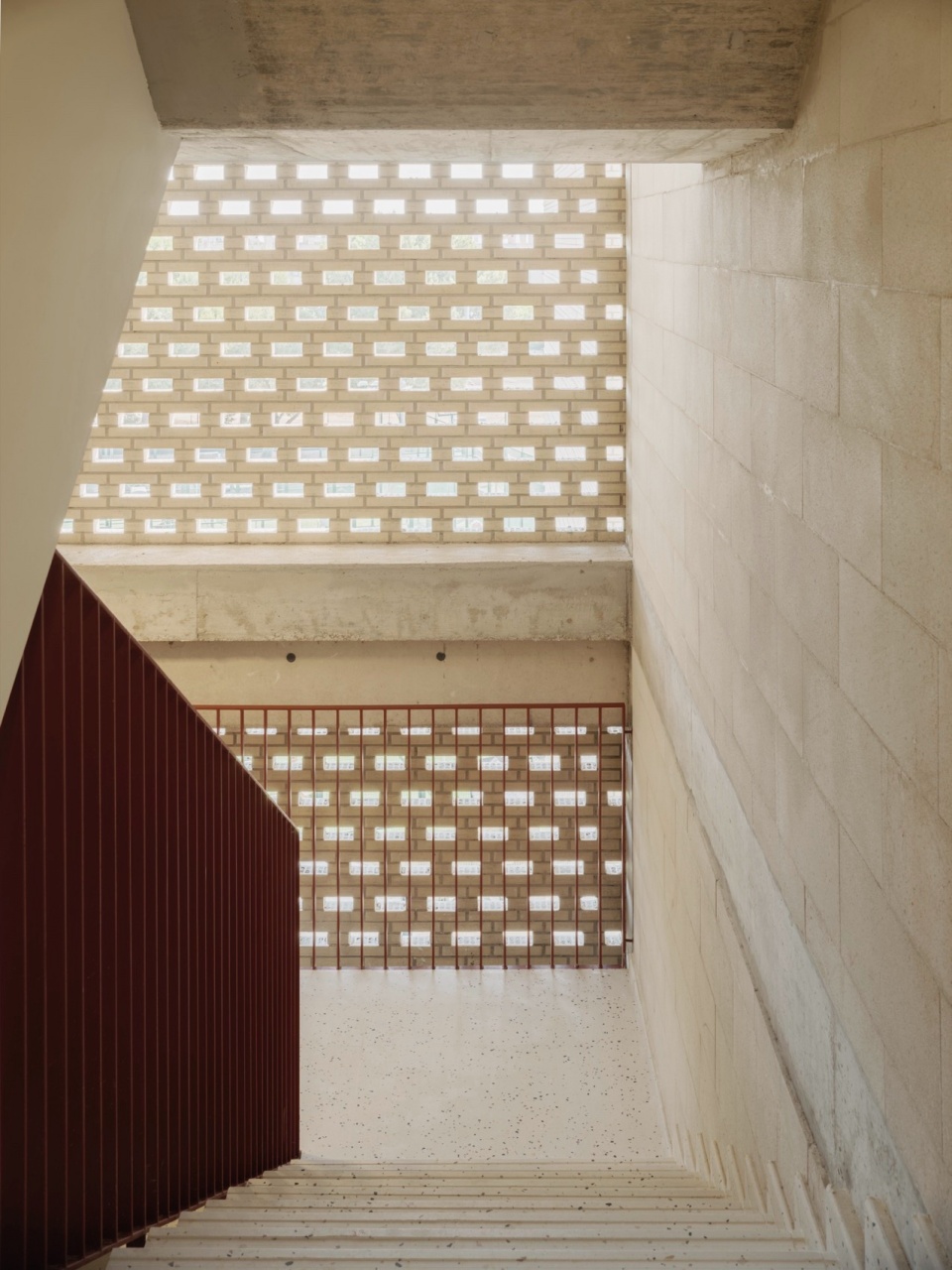 建筑共设置四个楼层。首层作为连接校园步行轴线与上部教学空间的过渡界面,与主体建筑之间通过一处有顶廊道相连,强化了室内外空间的衔接。这一层主要布置公共服务功能与餐厅。建筑整体由两个略有错动的体量构成,以最大化立面展开长度。中央设置了一处贯通多层的双层通高楼梯核心,既承担垂直交通功能,也鼓励使用者之间的交流与互动。围绕这一核心——其中还整合了服务空间与设备用房——流线空间被设计为“阿哥拉(agora)”式公共区域,不仅用于通行,更成为交流与停留的场所,并由此进入分布于立面一侧的教室,以获得最佳的自然采光与通风条件。
