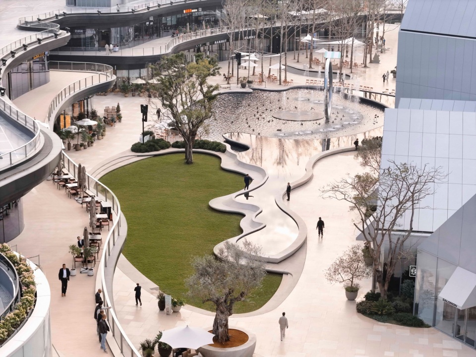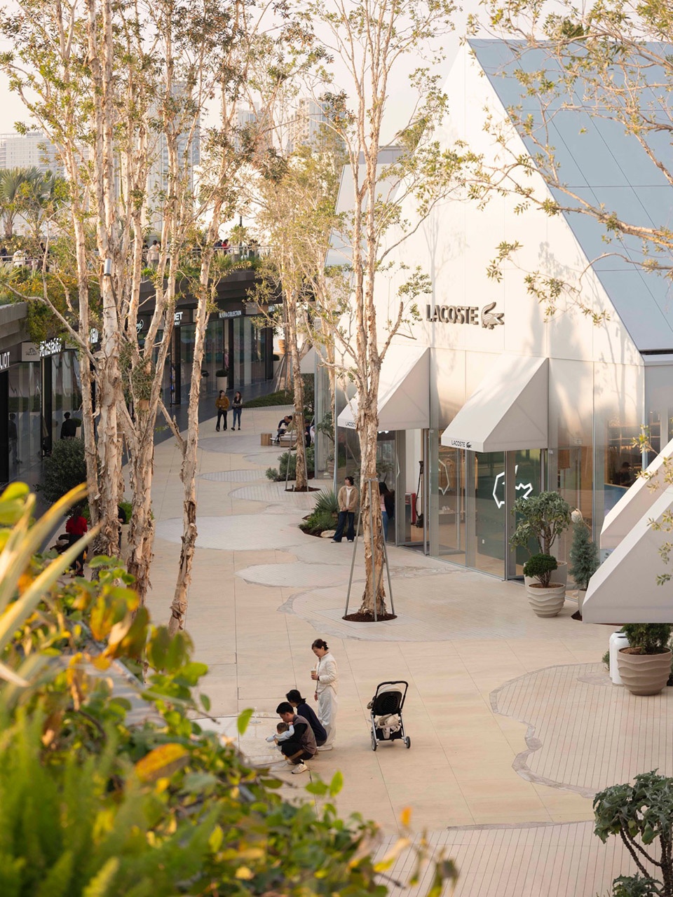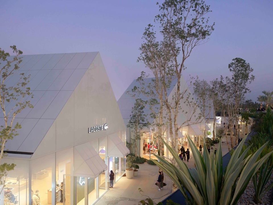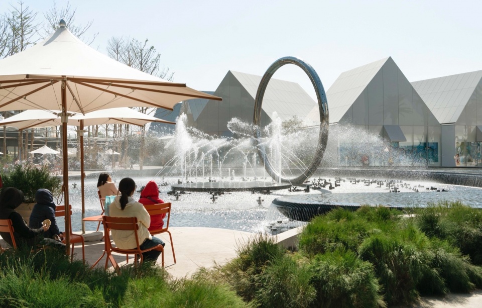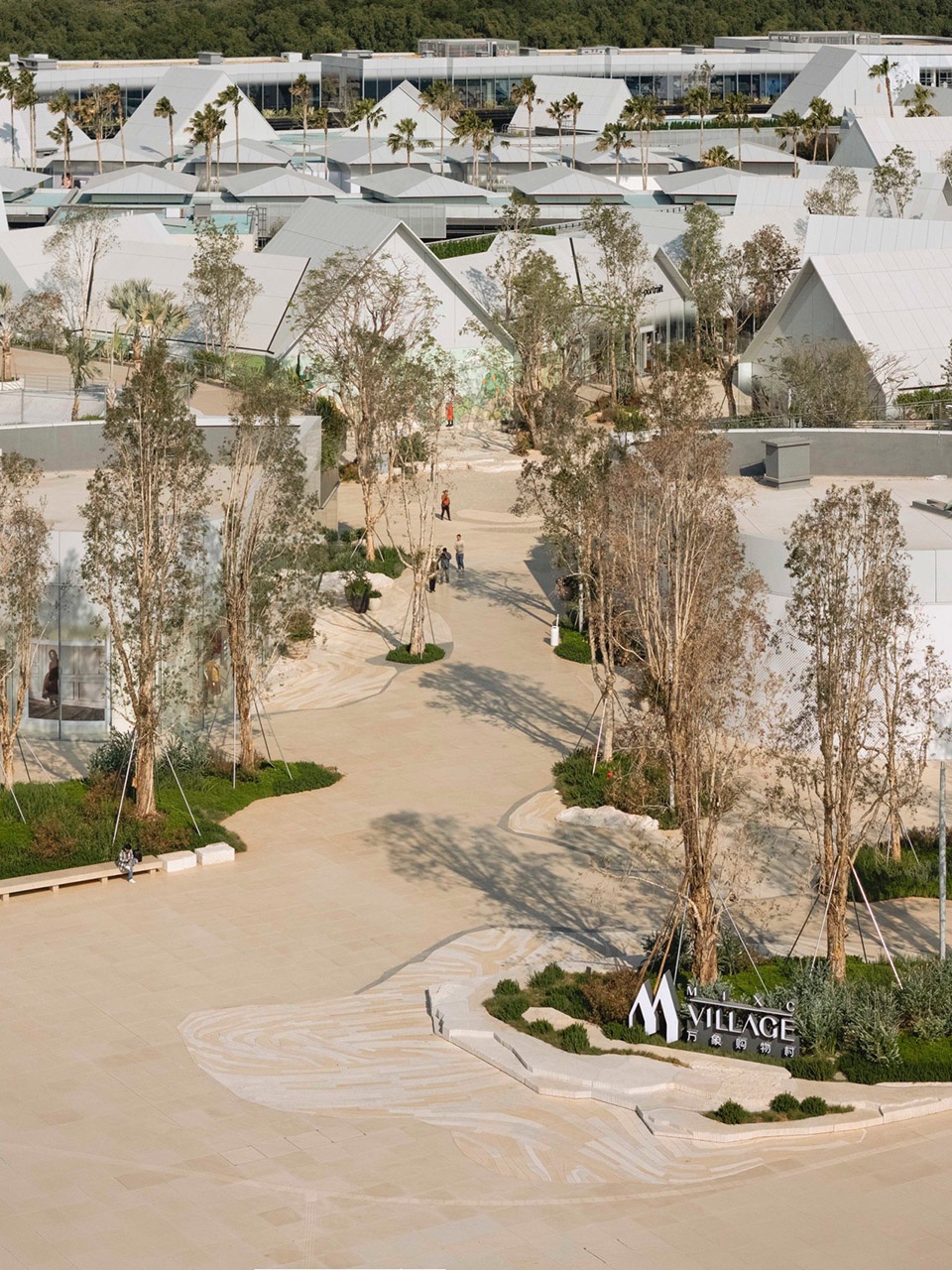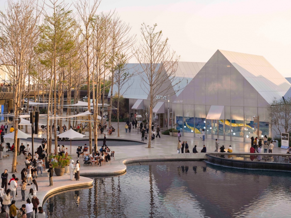 embraces the spatial texture of a coastal fishing village. The distinctive triangular-roof architecture, designed by Gianni Ranaulo, establishes a strong and recognisable silhouette across the site. The landscape scope extends across both ground-level and rooftop spaces. In response to the project’s objectives, the landscape framework is guided by a clear logic: “high mobility on the ground, high dwell time on the roof.” This dual system diversifies the retail experience—encouraging active wandering at grade while creating destinations for pause and stay above. At ground level, the public realm is composed of an outer ring, an inner ring, a Y-axis signature street, and the Central Lake Plaza. The spatial strategy is articulated as “less on the outer edge, richer in the middle, and most distilled at the core,” shaping a gradient from peripheral movement to immersive central experience.
