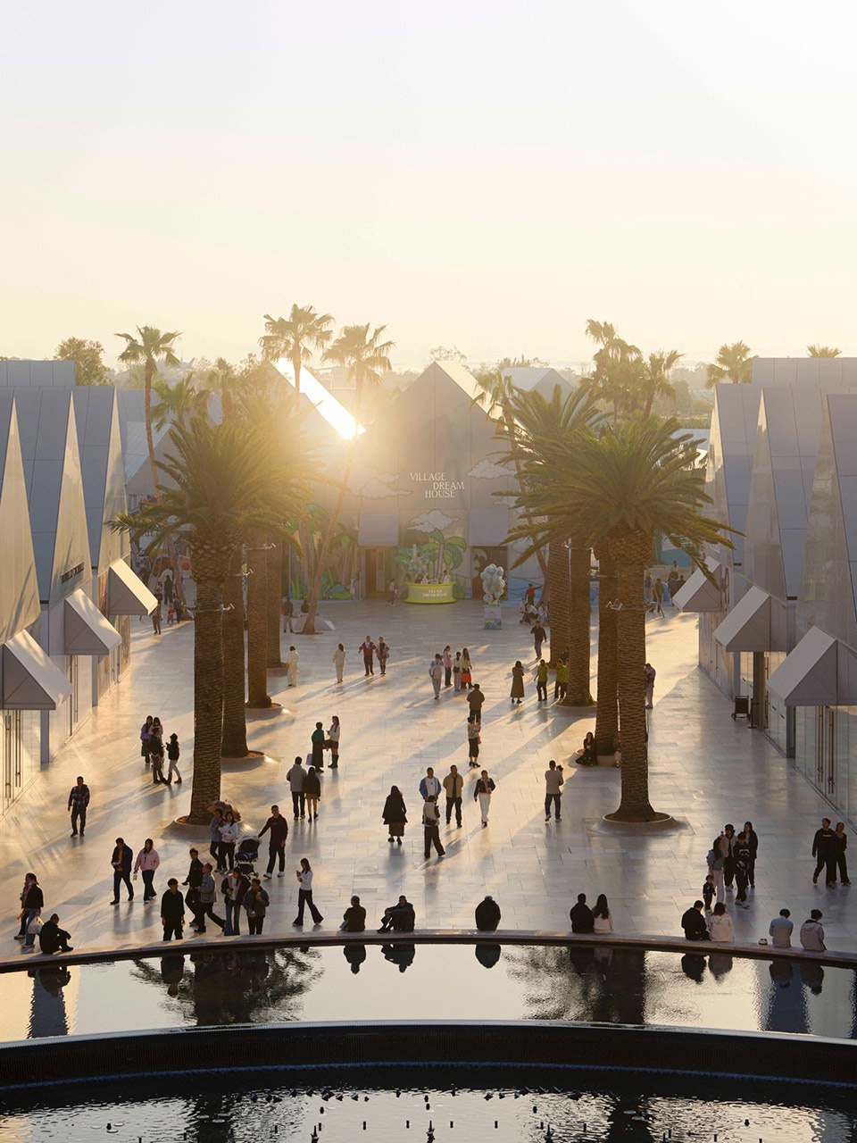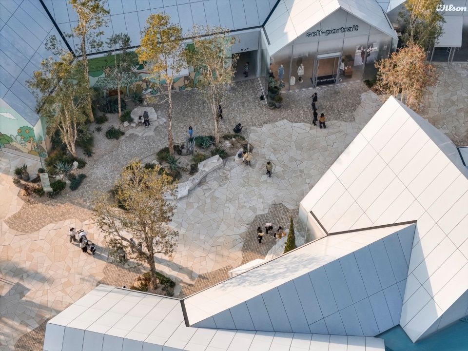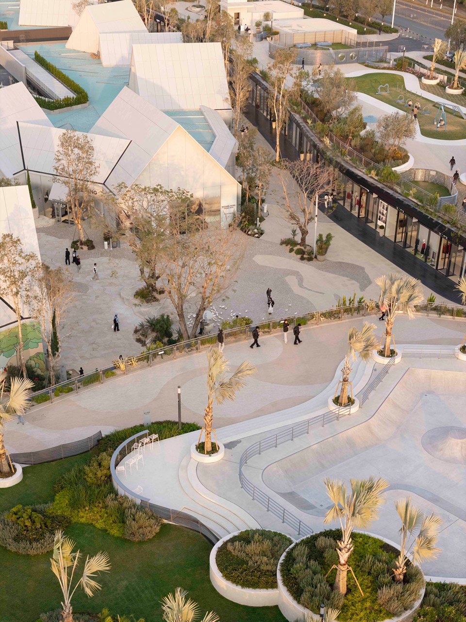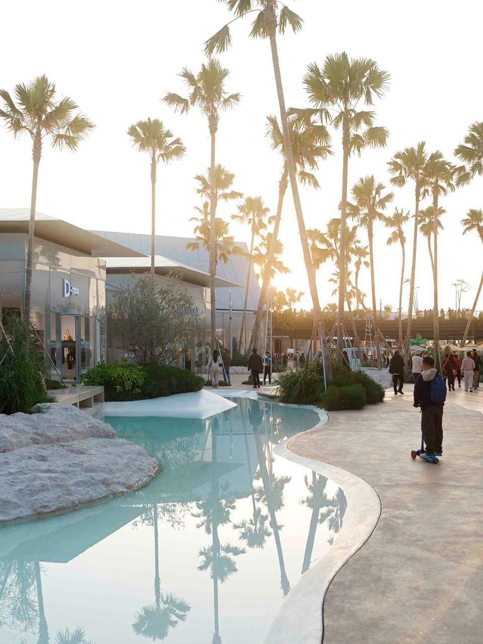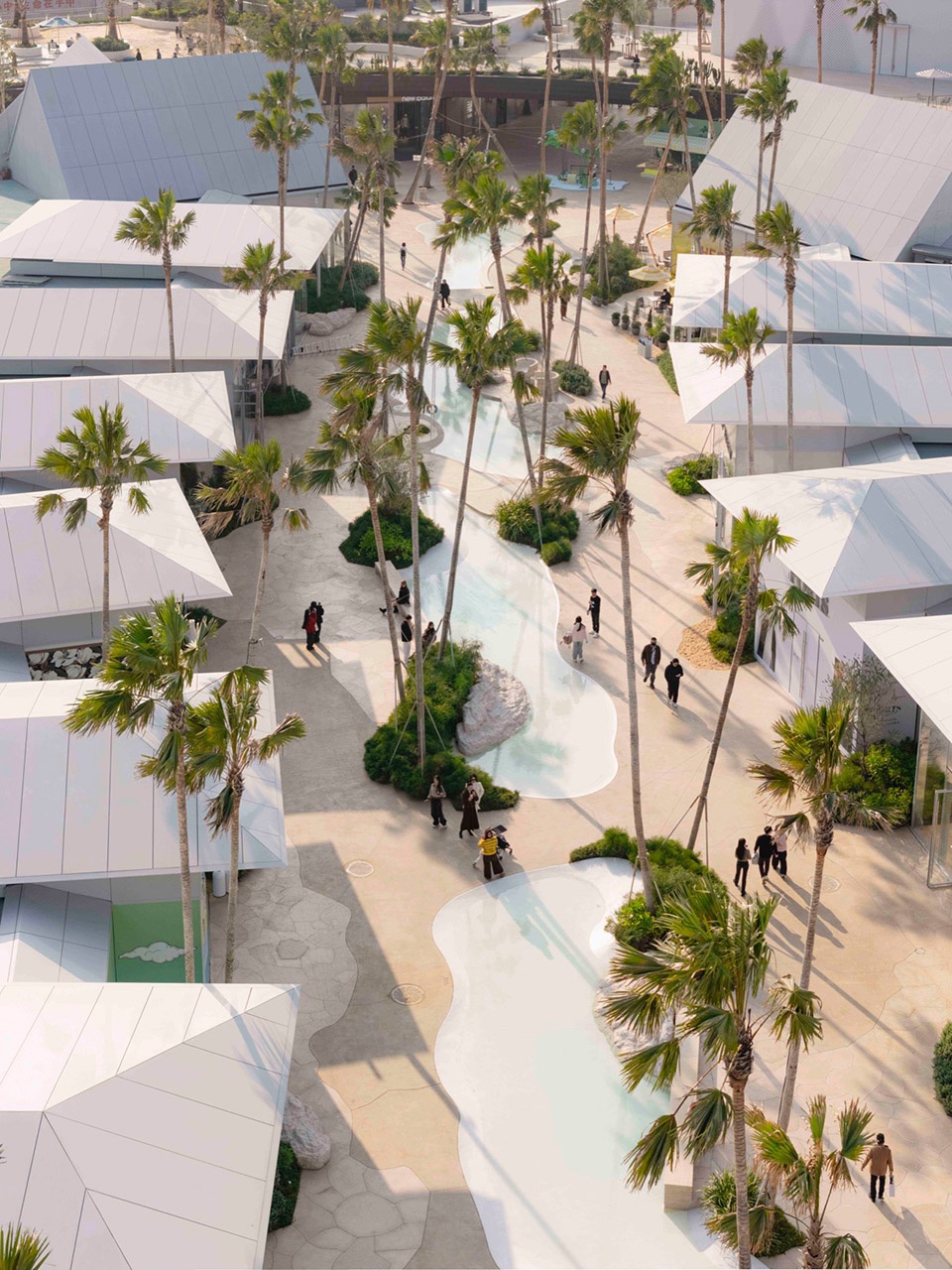 embraces the spatial texture of a coastal fishing village. The distinctive triangular-roof architecture, designed by Gianni Ranaulo, establishes a strong and recognisable silhouette across the site. The landscape scope extends across both ground-level and rooftop spaces. In response to the project’s objectives, the landscape framework is guided by a clear logic: “high mobility on the ground, high dwell time on the roof.” This dual system diversifies the retail experience—encouraging active wandering at grade while creating destinations for pause and stay above. At ground level, the public realm is composed of an outer ring, an inner ring, a Y-axis signature street, and the Central Lake Plaza. The spatial strategy is articulated as “less on the outer edge, richer in the middle, and most distilled at the core,” shaping a gradient from peripheral movement to immersive central experience.