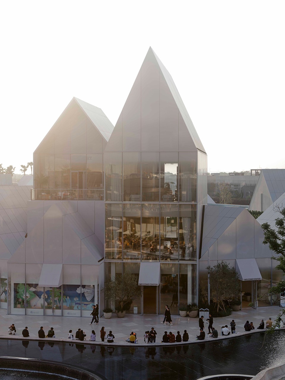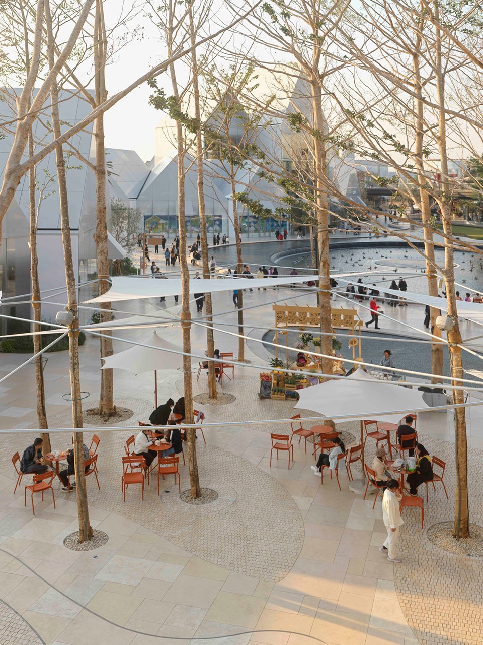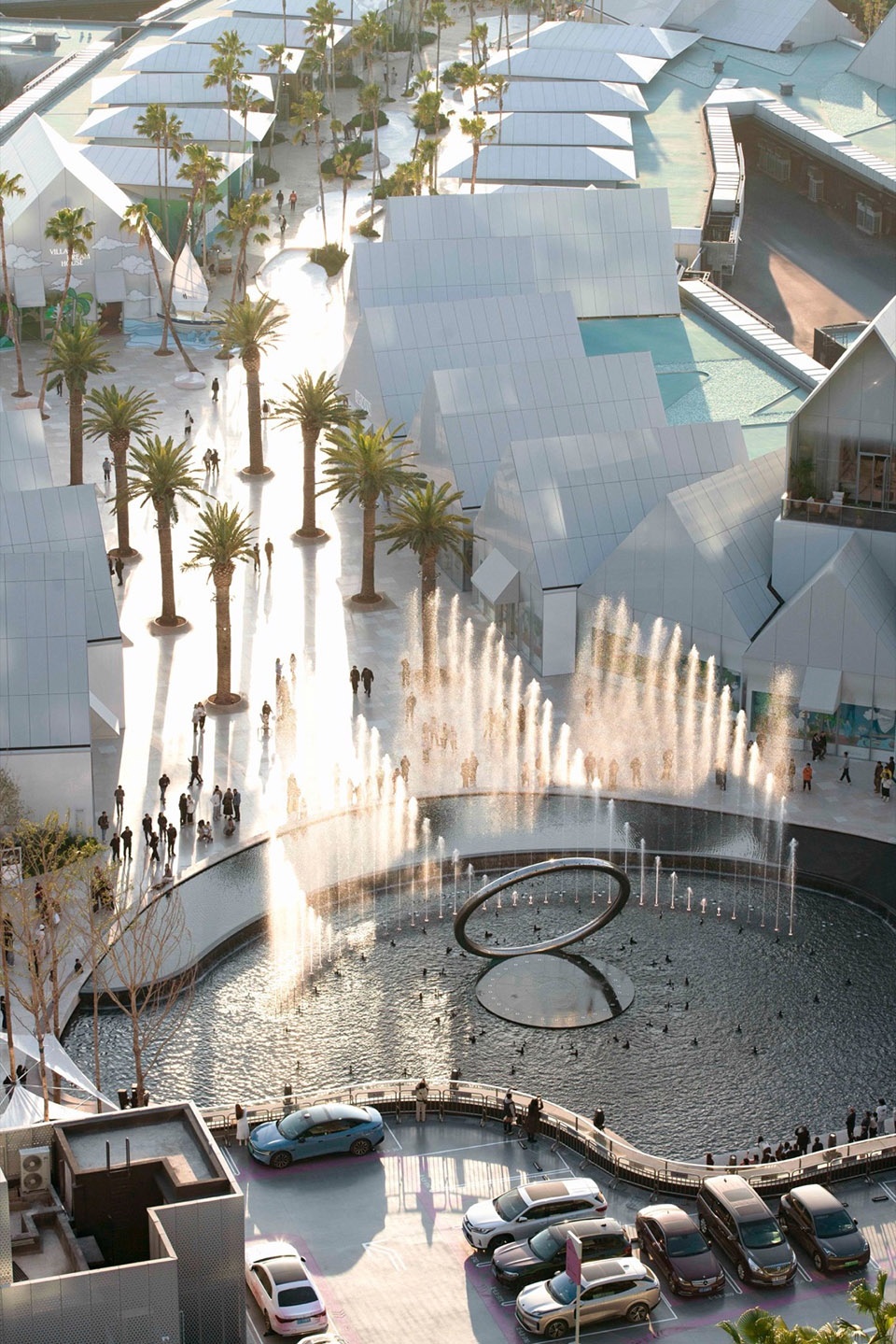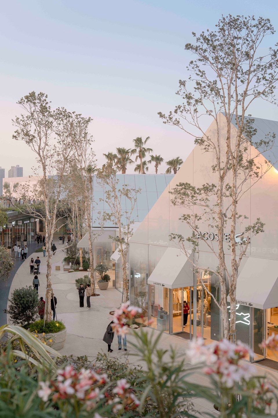 embraces the spatial texture of a coastal fishing village. The distinctive triangular-roof architecture, designed by Gianni Ranaulo, establishes a strong and recognisable silhouette across the site. The landscape scope extends across both ground-level and rooftop spaces. In response to the project’s objectives, the landscape framework is guided by a clear logic: “high mobility on the ground, high dwell time on the roof.” This dual system diversifies the retail experience—encouraging active wandering at grade while creating destinations for pause and stay above. At ground level, the public realm is composed of an outer ring, an inner ring, a Y-axis signature street, and the Central Lake Plaza. The spatial strategy is articulated as “less on the outer edge, richer in the middle, and most distilled at the core,” shaping a gradient from peripheral movement to immersive central experience.