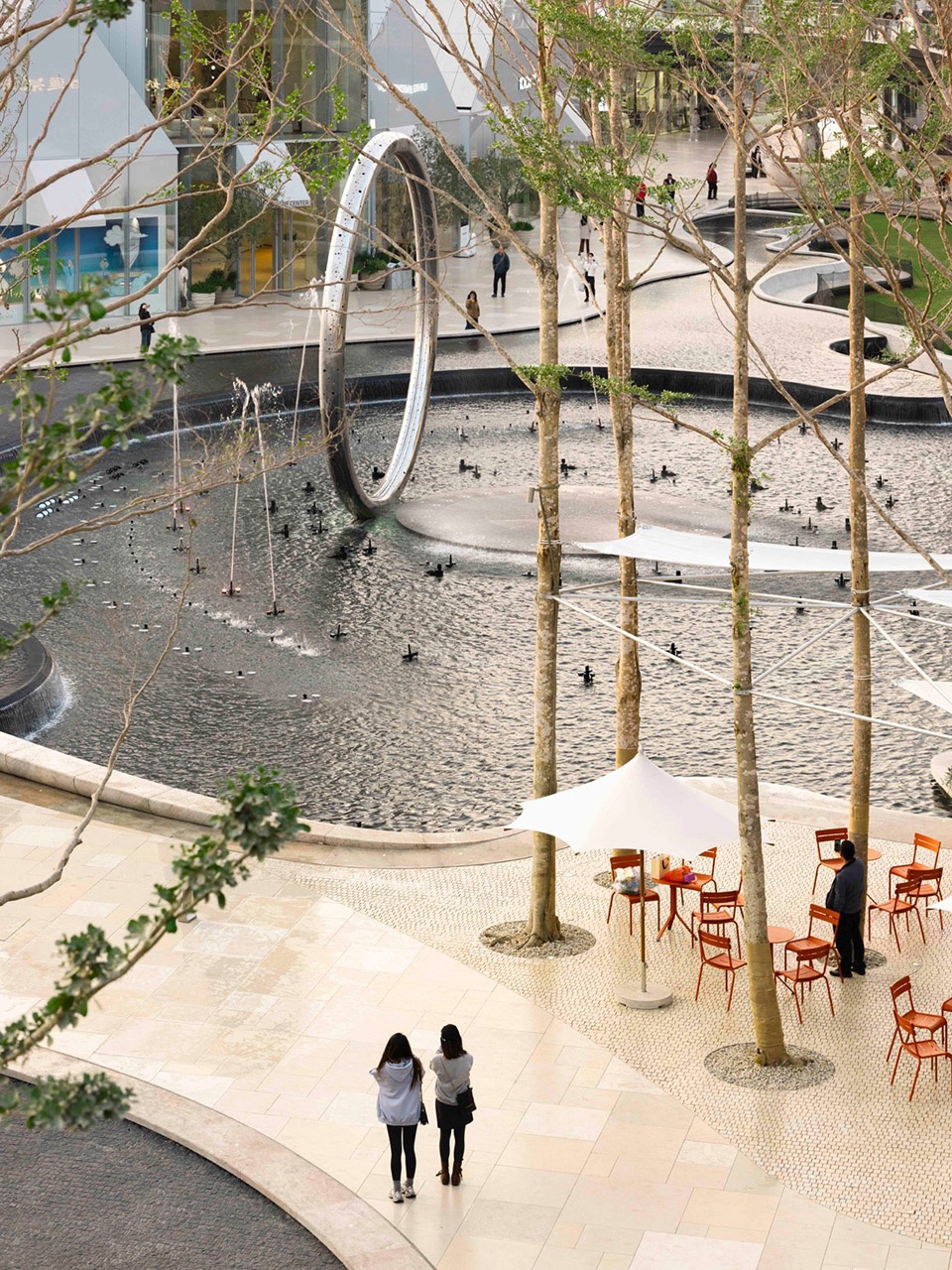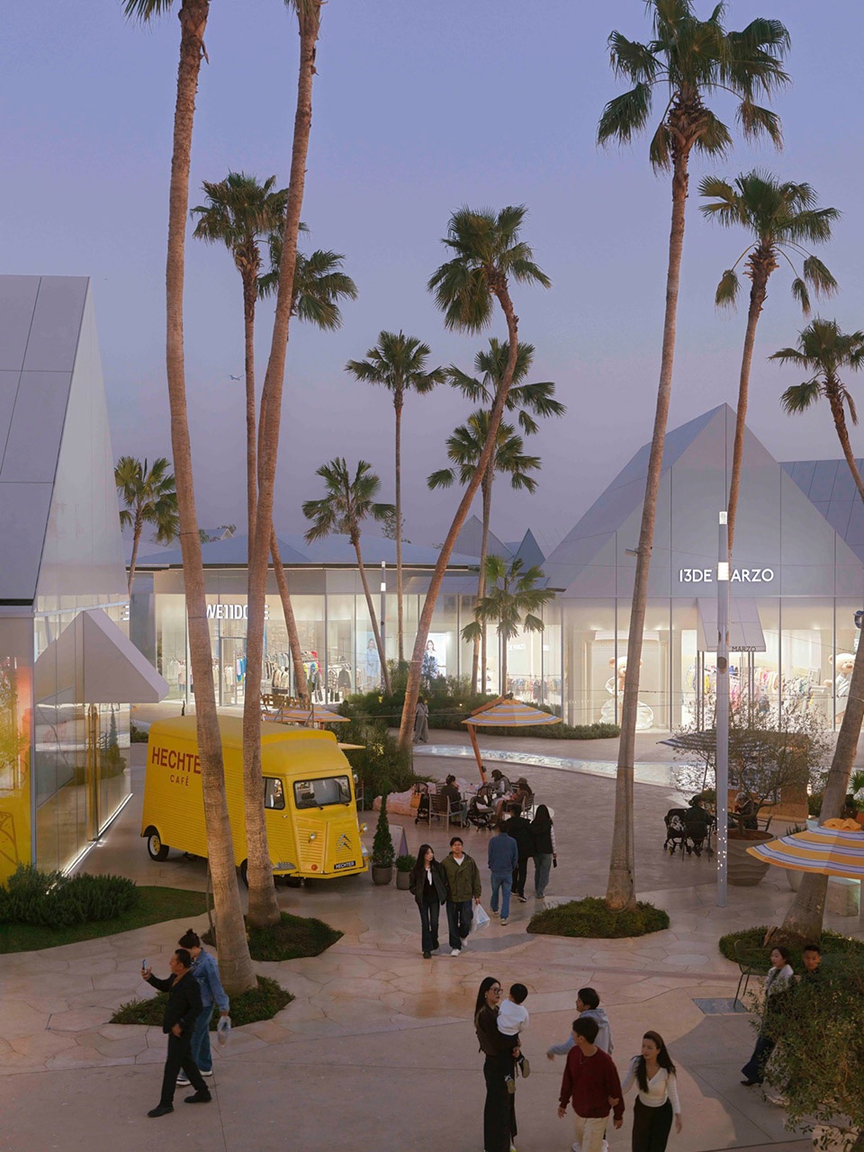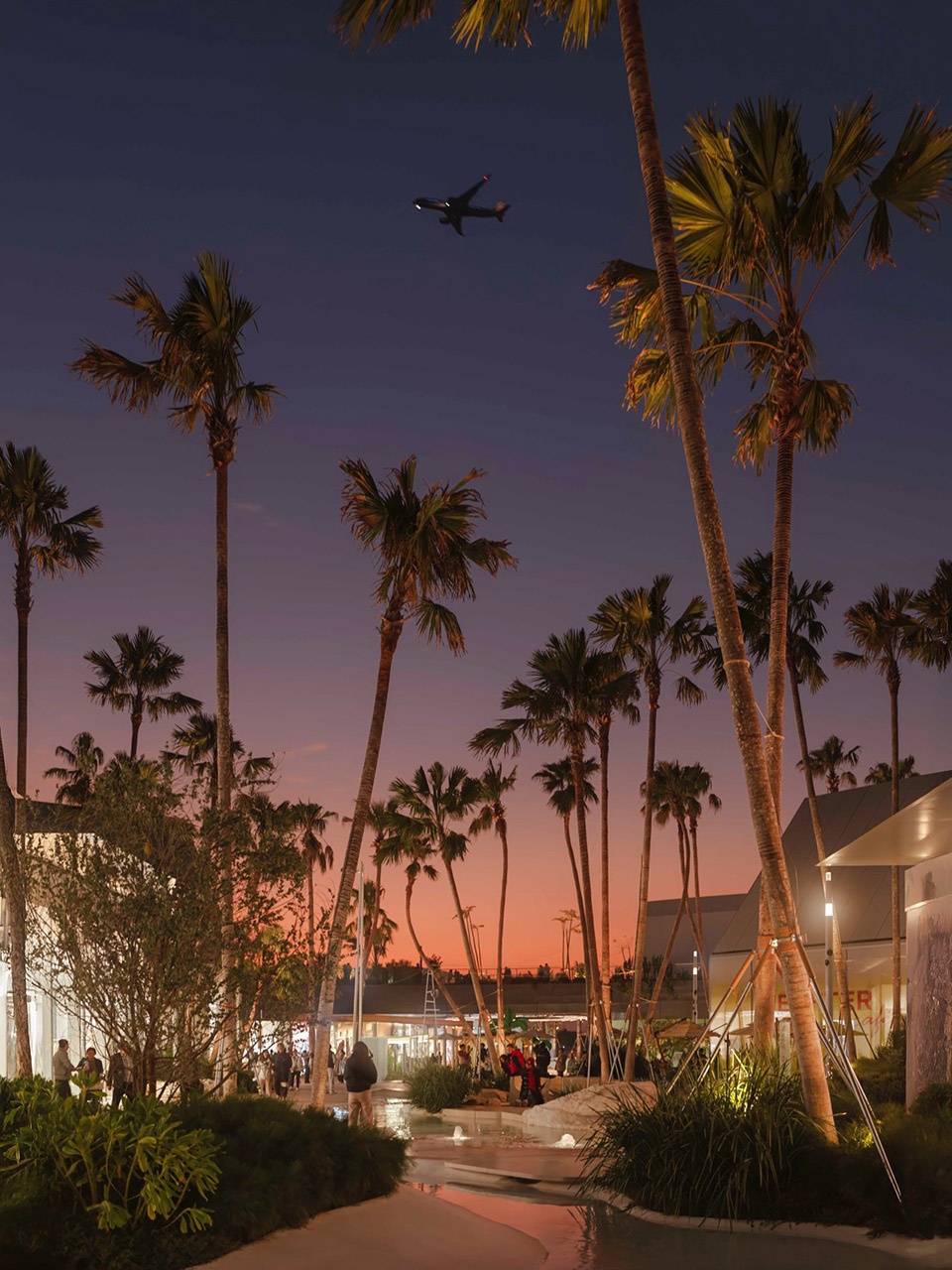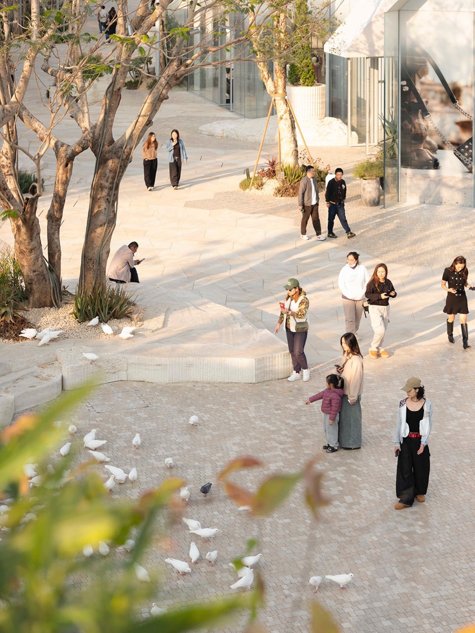 embraces the spatial texture of a coastal fishing village. The distinctive triangular-roof architecture, designed by Gianni Ranaulo, establishes a strong and recognisable silhouette across the site. The landscape scope extends across both ground-level and rooftop spaces. In response to the project’s objectives, the landscape framework is guided by a clear logic: “high mobility on the ground, high dwell time on the roof.” This dual system diversifies the retail experience—encouraging active wandering at grade while creating destinations for pause and stay above. At ground level, the public realm is composed of an outer ring, an inner ring, a Y-axis signature street, and the Central Lake Plaza. The spatial strategy is articulated as “less on the outer edge, richer in the middle, and most distilled at the core,” shaping a gradient from peripheral movement to immersive central experience.
