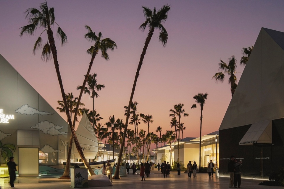 场地距离海岸线约10分钟的步行距离,坐拥夕阳、晚霞、飞机与航迹云等独特的在地资源。 这些特别的资源在景观设计之初就被纳入,成为场地设计中的重要元素。由此,项目被定义为“全中国唯一滨海奥莱”,强化松弛、浪漫、治愈的空间基调,并在概念构建之时,与场景设计同步策划了温暖的故事线——“夏日永不落幕”,以唤起海岸的度假联想。