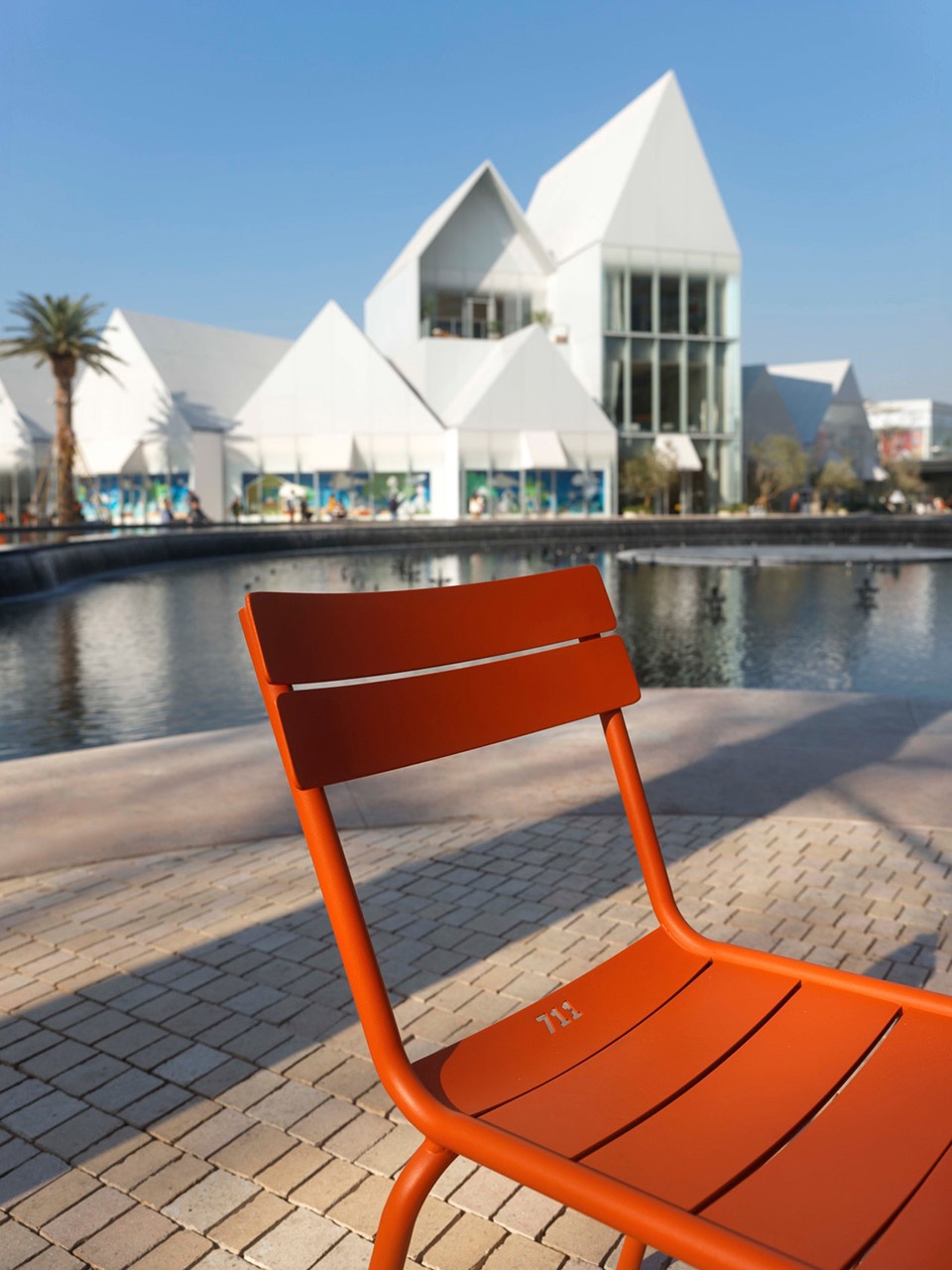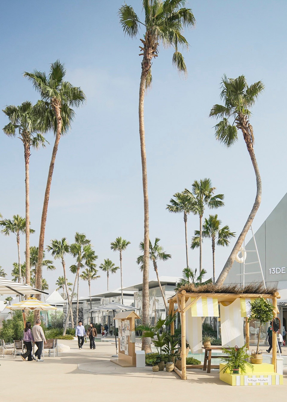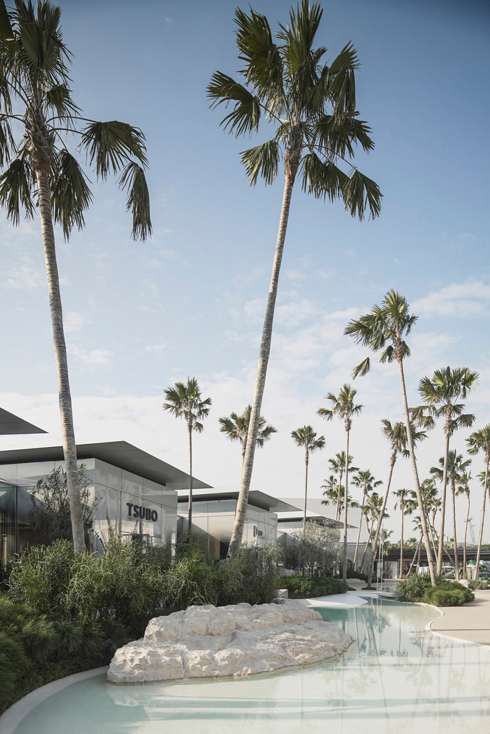 At the heart of the “island,” the 70-metre Grand Avenue is structured by a procession of eight monumental date palms, forming a calm, legible allée. One side opens generously to the Central Lake Plaza, while the other addresses a more atmospheric square shaded by Livistona palms. Intentionally restrained and symmetrical, the space is conceived as a quiet void—a piece of breathing room within the village that leaves capacity for changing scenes. It offers a timeless setting today, and a ready stage for future retail programming, performances, and public gatherings.