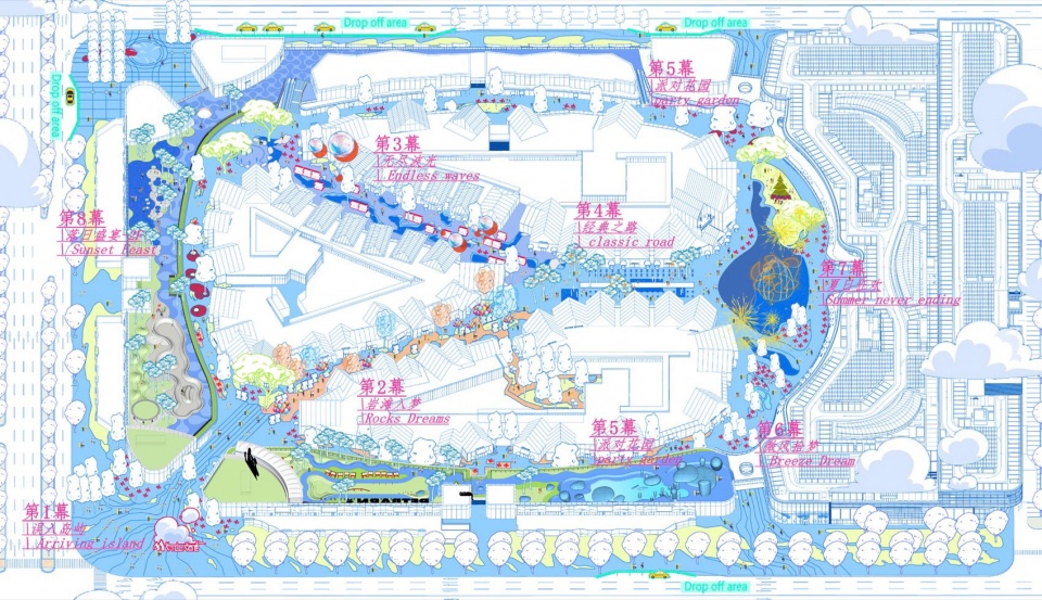 项目整体规划呈现近海渔村村落式的空间肌理,其独特的三角屋建筑由建筑师Gianni Ranaulo操刀设计,景观设计范畴包含地面与屋顶空间。基于项目设计目标,景观提出“首层强游逛、屋面强停留”的设计逻辑,以实现购物场景的多元化体验。其中,地面空间由外环街区、内环街区、Y轴主题街区、中心湖广场构成,以“外少-中多-内纯粹”作为空间理念;屋顶空间则设立四个独立主题的花园 —— 沙滩、滑板场、宠物乐园与多功能草坪,各场景相互独立又连续。