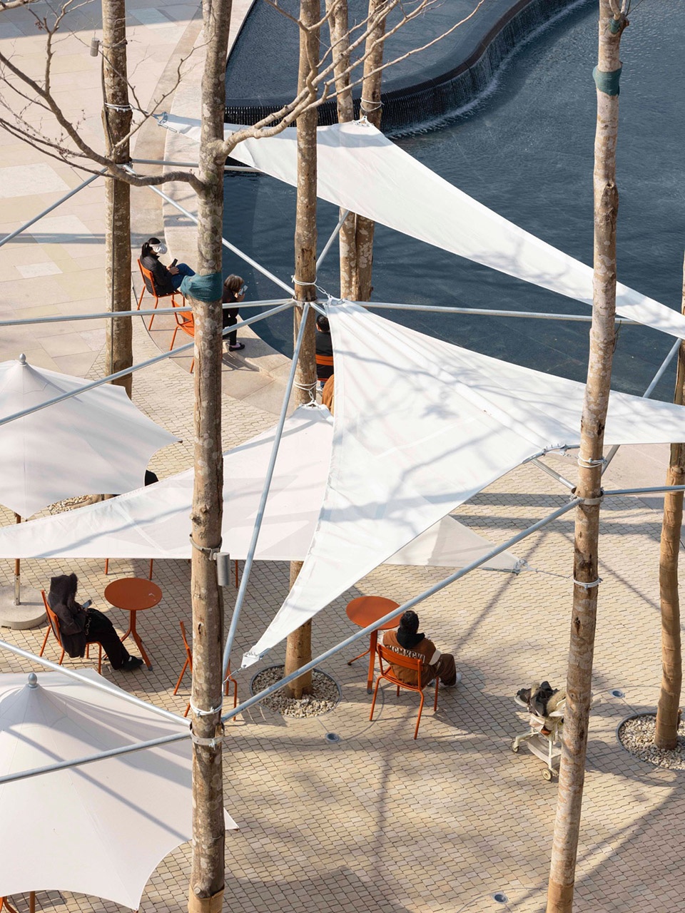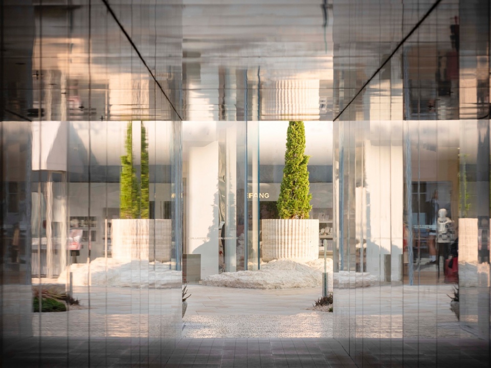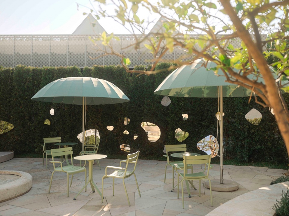 In the Lemon Courtyard, mirrors are designed as playful, theatrical installations. Set at varying angles, they fragment the space into countless scene-like slices—montage-like reflections that capture not only the self, but also the relationships within the setting: between people, between seating and water basins, and between sky and planting. These subtle connections become part of the spatial experience.
