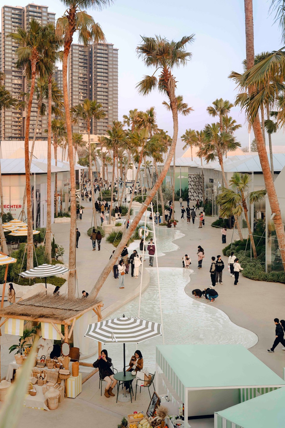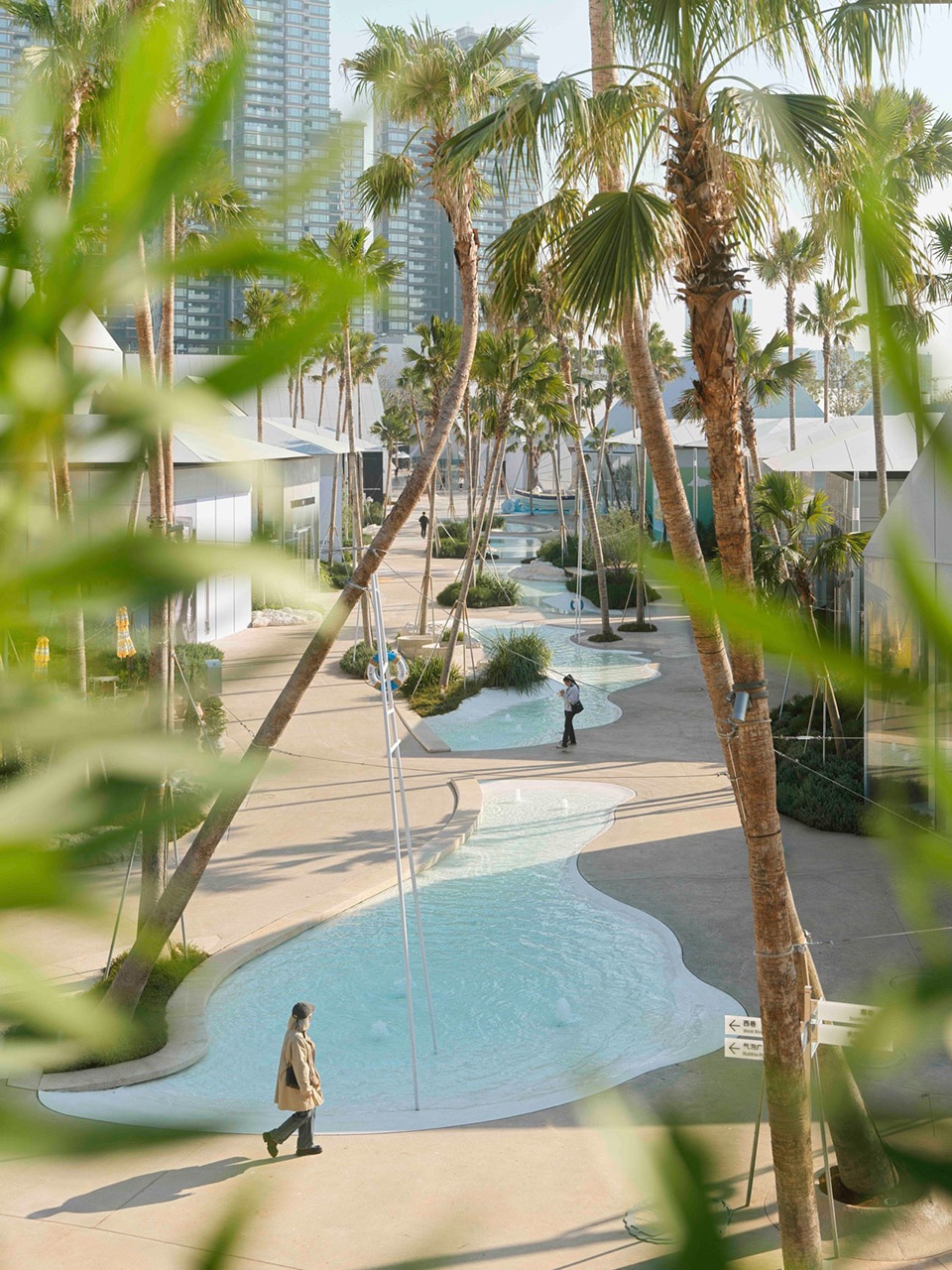 Conceived as a “slow-motion beach” sequence, Water Street is the most resort-like district within the village- framing a clear visual relationship between the central water “island” and the sunset at the street’s end. In shaping the scene, arching fan palms introduce a tropical warmth, while soft, cloud-like sea-coral planting amplifies an easy, unhurried atmosphere. The pool base is finished in warm off-white terrazzo, bringing out the shallow, translucent blues of the water. Underfoot, a coarser pebble-aggregate surface evokes the grain of a natural beach, while embedded marine-fossil-like aggregates offer small moments of discovery along the walk. The dialogue between gloss and grit reinterprets material refinement—finding delicacy not only in polish, but also in texture.