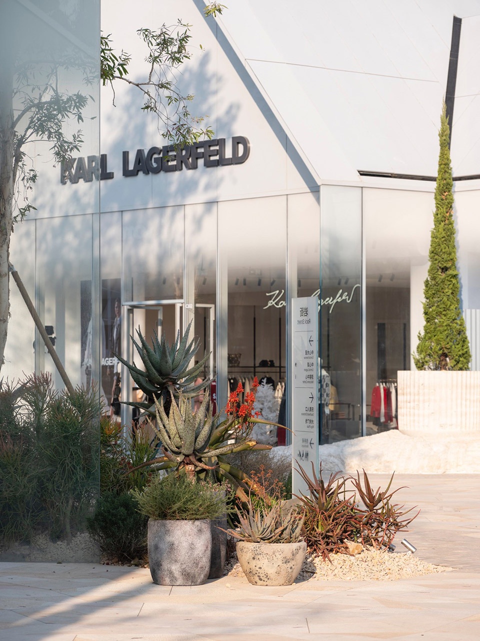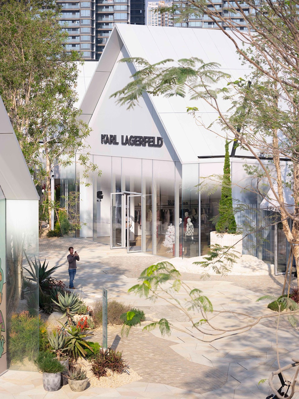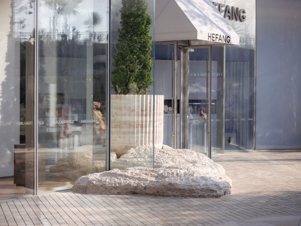 在空间上,前后进退的店铺关系为不同尺度的店面花园提供了条件,其中岩石展台、巨型花钵、礁石座椅则作为景观与商家的奇妙互动纳入其中。