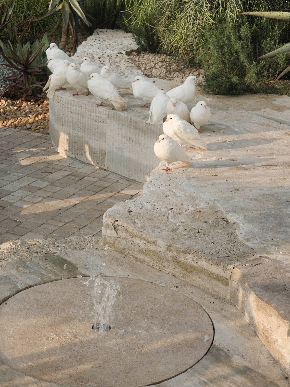 Fountain jets and white doves animate the space