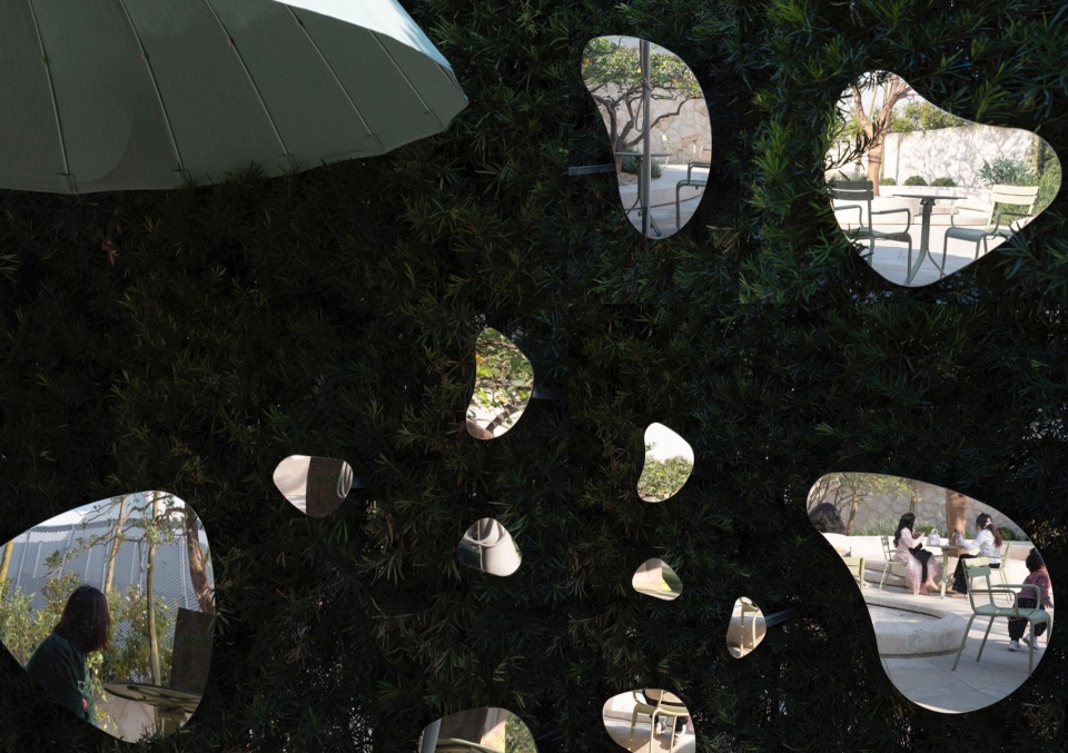 镜子在柠檬花园里被设计为具有戏剧性的趣味装置。不同角度的镜面将空间分割为无数场景的切片,以蒙太奇的手法,映照本人的同时,也映照出场所中人与人的关系,椅子与水钵的关系,天空与植物的关系。这种细微的链接,成为空间体验的一部分。