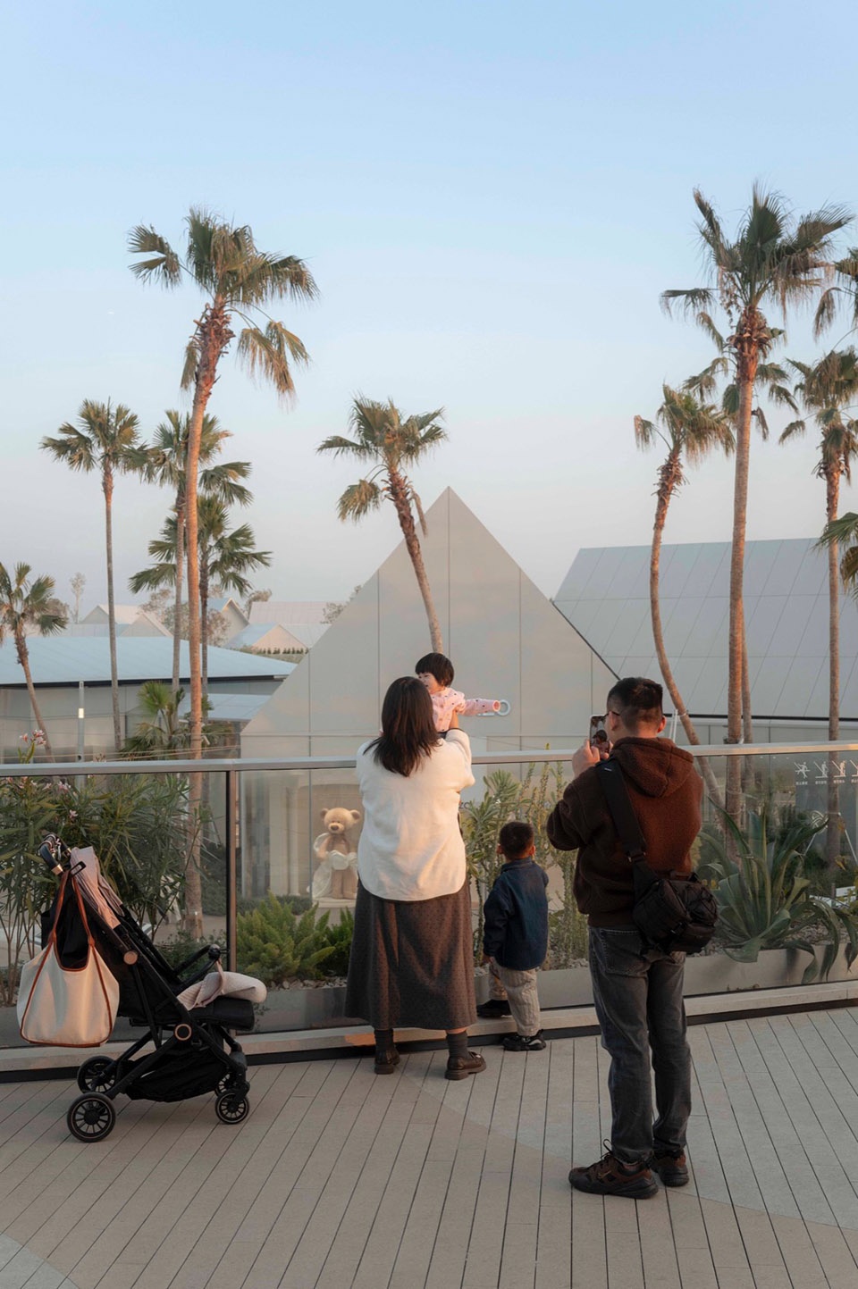 The rooftop landscape reclaims non-commercial terraces as a key destination layer. To foreground the site’s local atmospheres—sunset light and afterglow skies, aircraft overhead, and drifting contrails—the roof is organised as four themed “islands”: a Beach Lounge Isle, a Sunset Skate Park, a Bubble Play Island, and a Pet Island. Together, they propose a form of “zero-cost romance”—everyday, accessible moments of escape for Greater Bay Area residents. In contrast to the ground level’s timeless, classic restraint, the rooftop shifts into a more celebratory register: playful, active, and vividly scenographic. The colour palette follows suit, adopting brighter tones such as Coastal Blue and Sunset Orange to heighten the energy of each recreational scene.
