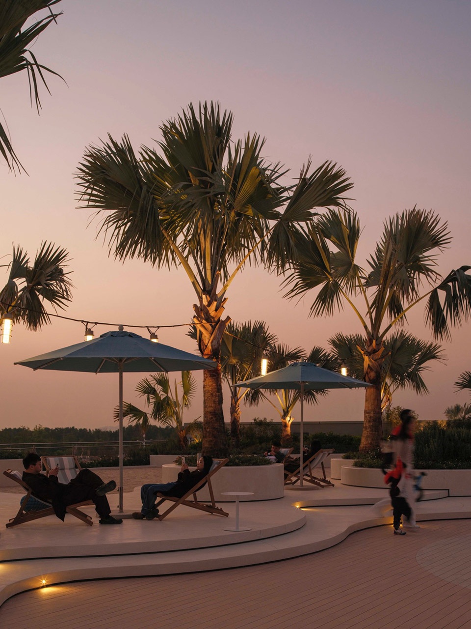 At the meeting line of lawn and water, two island-like platforms are introduced as lookout and photo moments. The area is further animated by plaza furnishings in a “sunset orange” palette, reinforcing the warm coastal atmosphere.
