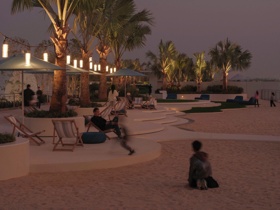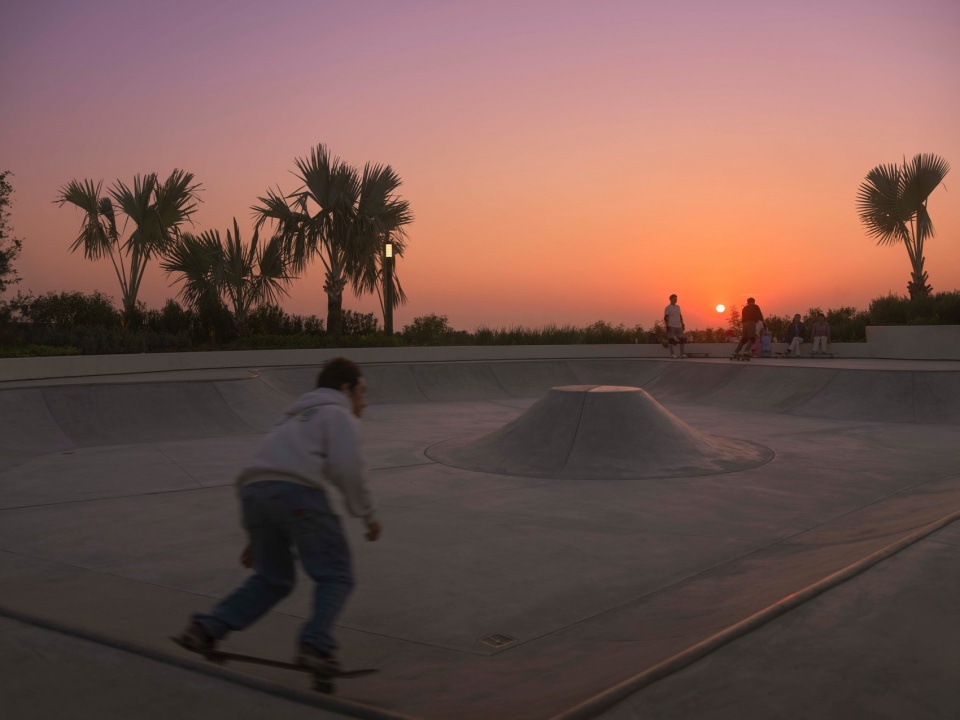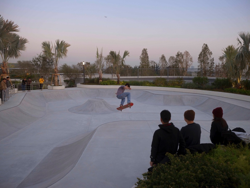 南侧屋面是距离海岸最近的区域,傍晚时分拥有绝佳的落日场景。设计以“沙滩躺岛”与“日落滑板场”两个主题空间,通过人群交谈、漫步、运动等场景,将海岸的氛围延伸至此处。约1000㎡的沙滩躺岛包含梦幻沙滩、躺岛草坪及夕阳包厢等观景休憩区;日落滑板场则以500㎡的碗池滑板区和700㎡的集市草坪,构筑了一处充满活力的青年聚集地。每日傍晚时分,沙滩上闲适散坐的人群与落日下纵情滑行的少年尽情的享受着霞光下的场地,形成静与动的浪漫场景。