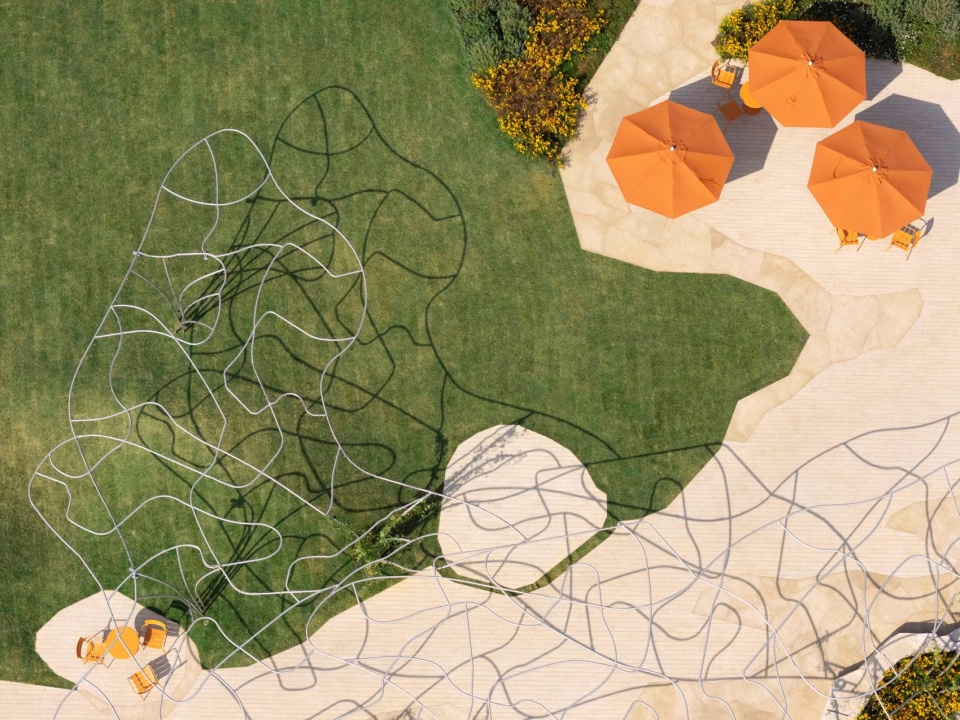 泡泡岛屿是一座以自然体验为主的无器械儿童活动花园,草坡,光影成为淳朴的玩伴。场地内无规律的线条构筑设计灵感来自于儿童的涂鸦笔触;通过线条对天空与光影进行视觉划分,随着时间推移,阴影在地面持续变化,形成动态的、与自然共生的画面。