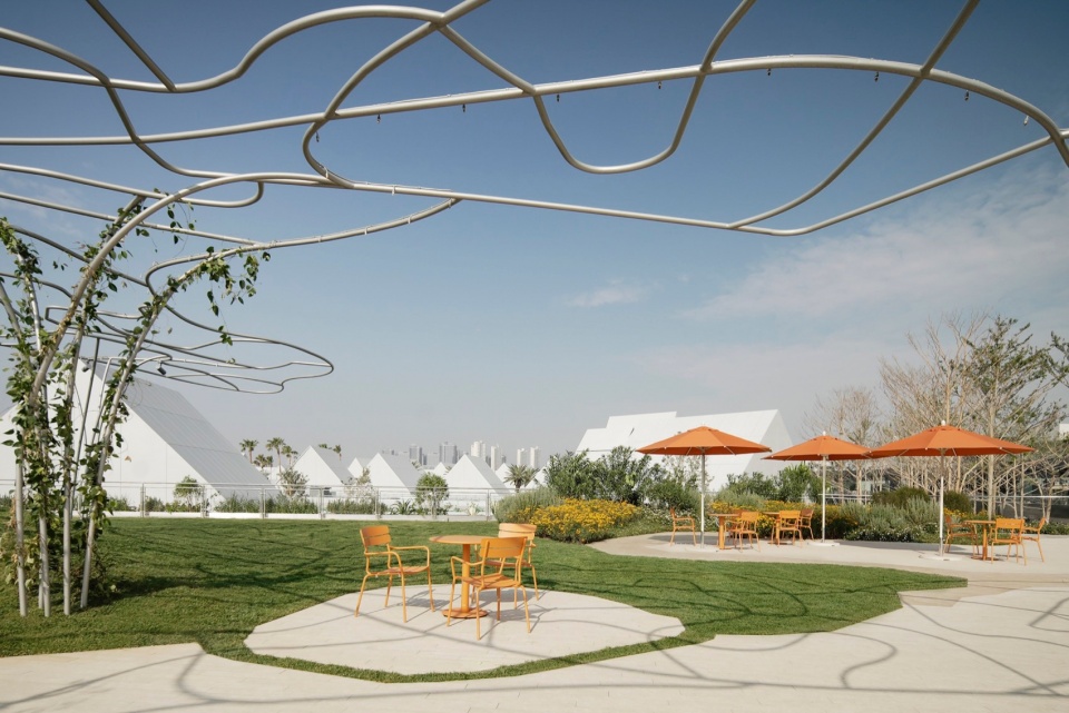 草坪与水线交接的区域,提供了两处供人观赏与打卡的岛屿平台,并设置了以“日落橘”颜色为主题的广场家具。
