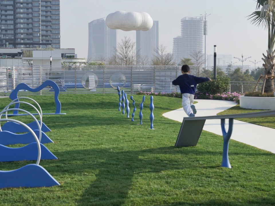 二层屋面景观设计将非消费的屋顶空间转化为具有核心吸引力的活动目的地。为强化夕阳、晚霞、飞机与航迹云等独特的在地资源 ,屋顶花园被设计为沙滩躺岛、落日滑板场、泡泡岛屿、宠物岛屿四个不同属性的主题乐园,立旨构建属于大湾区民众的“零成本浪漫”。相比首层经典隽永的风格,屋面更加强调欢乐、活跃,绚烂的活动场景。主题色彩也选用“滨海蓝”“日落橘”等更为艳丽的色彩。