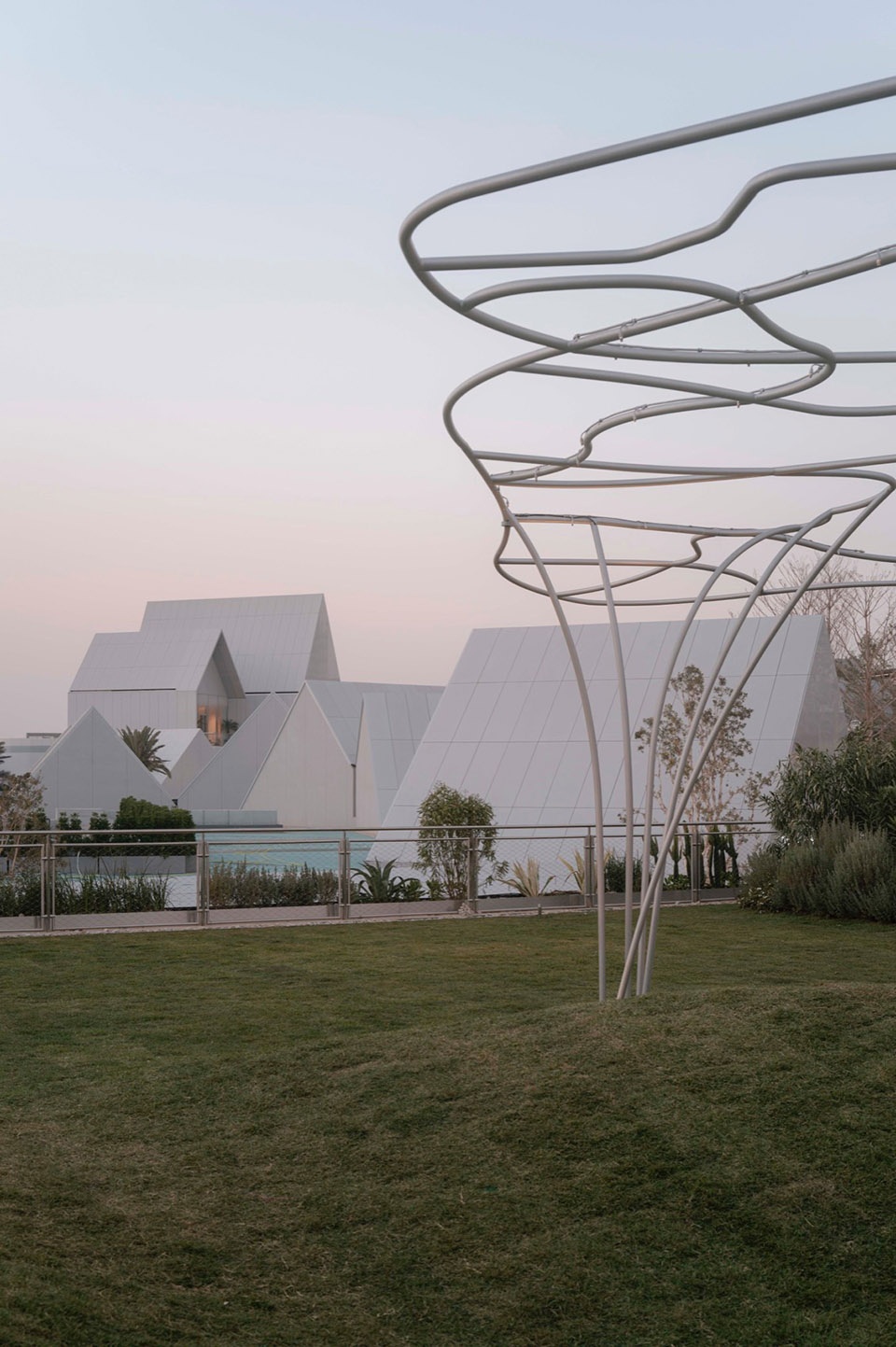 Inspired by the “traces left by a sea breeze,” the overall outer interface features undulating green slopes. These landforms gently lift the iconic white triangular roofs and support the illusion of floating “art clouds” suspended overhead, collectively composing the first, defining vista upon “island” arrival.