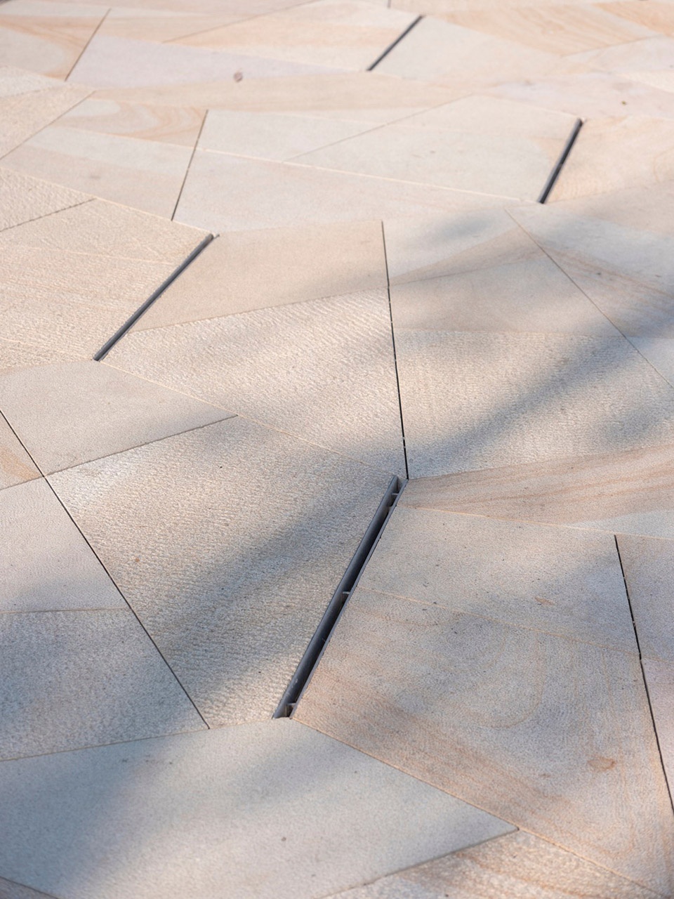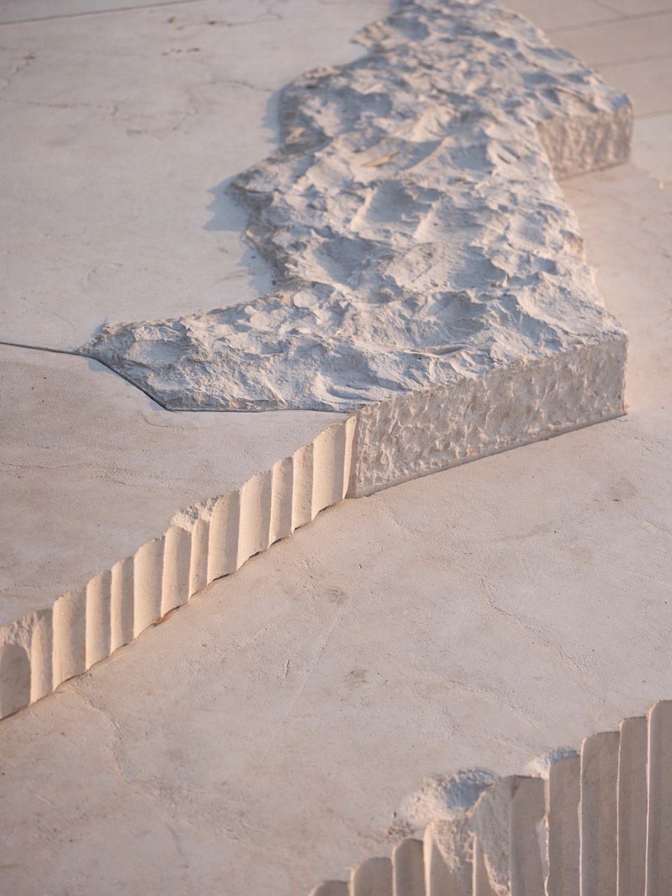Rock Street is imagined as “small houses growing out of a reef shore,” with a low-saturation bay-cliff grey setting the tonal baseline. Across the district, more than ten varieties of natural stone are employed- from paving to façade- where the stone’s hue, grain, porosity, and surface sheen are carefully composed as primary design considerations.