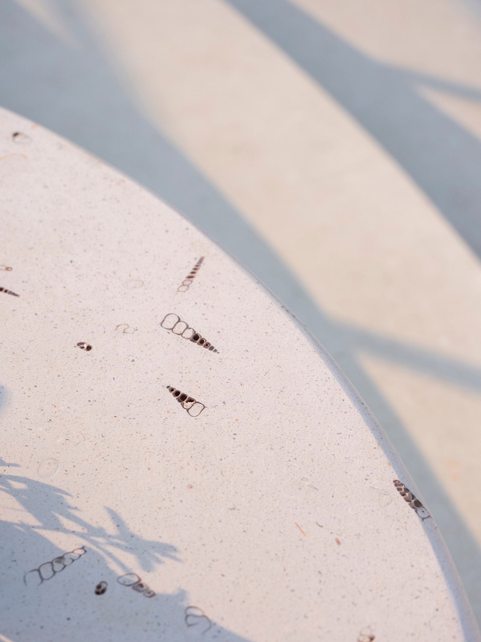 水街以“海滩慢镜头”为主题,是购物村里度假氛围最浓郁的街区,给中心水岛与街道尽头的落日提供了完美的视效关系。在场景设计的考量上,摇曳的圆叶蒲葵带来了热带的温度,蓬松的海珊瑚则将场所烘托得更为松弛。池底选用米白色系水磨石,衬托出浅滩的透蓝水色;地面则采用更加粗粝质感的砾石聚合物,模拟出自然沙滩的质地;其间点缀的海洋生物骨料,为漫步者带来持续探索的惊喜。光泽与粗粝的对比,也重新诠释了材料中的精致与细腻。