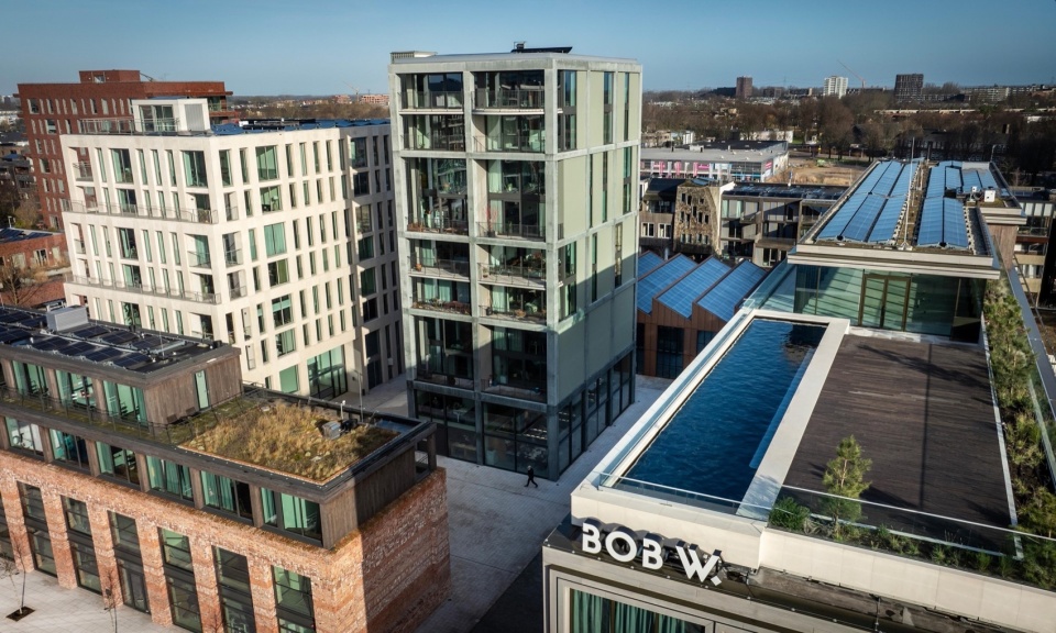 All of this is ‘lifted’ on a half-submerged parking garage with charging points for electric shared cars and a large bicycle parking area. Furthermore, experimentation is being done with sustainable and circular materials and installation techniques such as greywater reuse, a self-established electric power company, a micro-grid, heat recovery from air and sewage water, and waste separation.