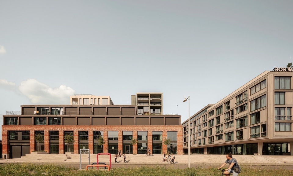 项目中的柔绿色混凝土塔楼采用可适应的核心筒与结构体系,内部为 Superloft 户型,使居民能够对室内空间进行高度个性化的改造。它标志着中央“村庄广场”,广场铺设可拆卸的天然石材。白色住宅楼采用永恒耐用、经特殊型材处理的混凝土(部分为再生材料);公寓酒店建筑采用木立面,来源于可再生资源;仓库式办公楼则使用可回收、耐久的耐候钢(Corten steel),并因其额外的净高而具备制造业使用的可能性。咖啡馆与联合办公空间的砖立面则由回收砖砌成,通过不同的表面处理与砌筑方式呈现丰富肌理。