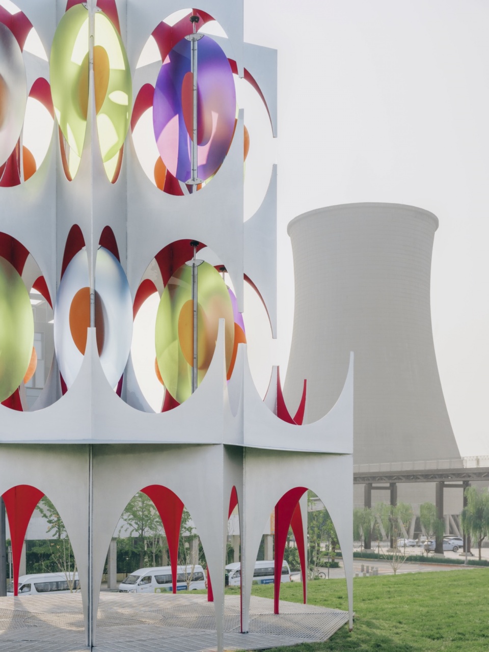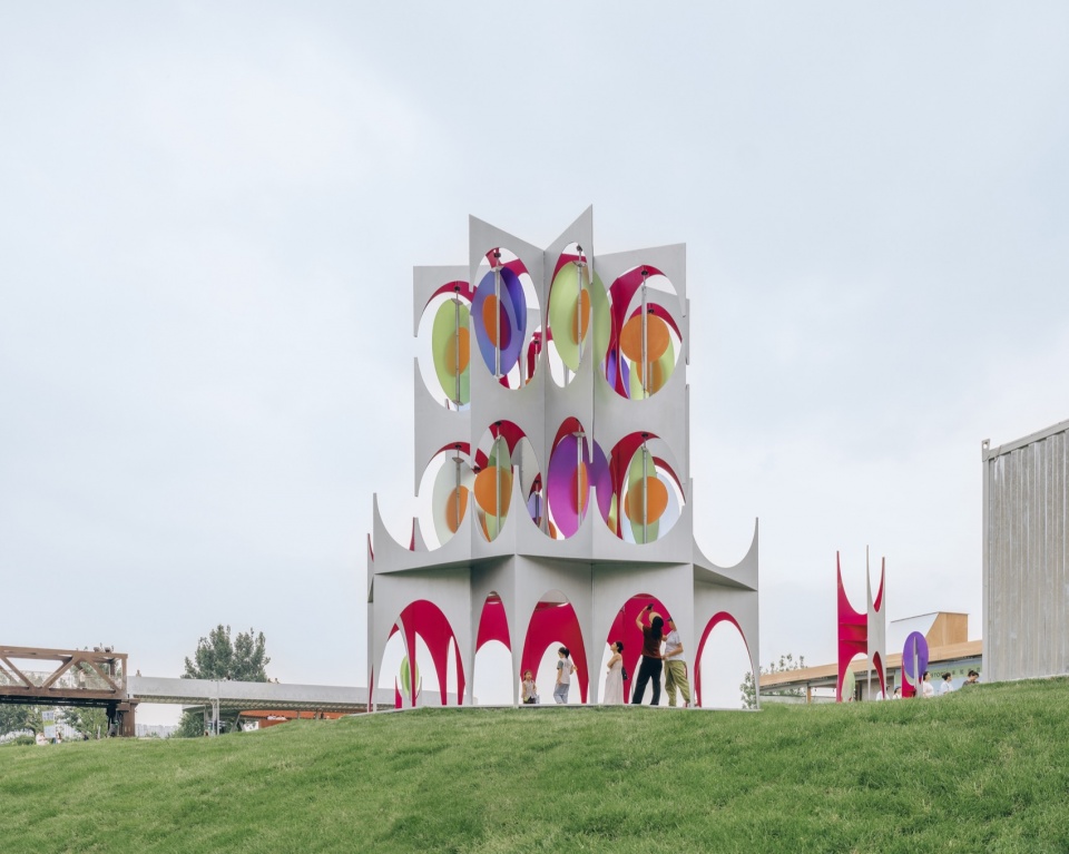 With an octagonal frame and a form echoing paper folds, OctaPlay reimagines Shougang Park’s iconic chimneys as a delicate, abstract form in motion. Translucent discs, evoking delicate paper cuts, rotate gently in the wind. As they move, colors layer and blend, creating a continuously shifting spectrum—a stage where time, light, and natural forces dance in harmony.
