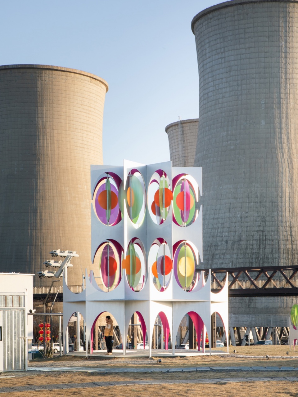 作品“八面游戏”——它以八边形类似折纸般的轻盈姿态,对首钢园标志性的工业烟囱进行拓扑转译,像是在纸面剪下的半透明彩色叶片在风中缓缓旋转、交叠,色彩在运动中叠加、流转,如同一座不断重组的光谱剧场,这里的时间、色彩与自然力相互游戏。