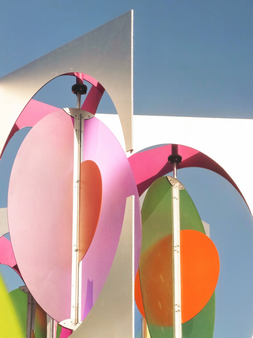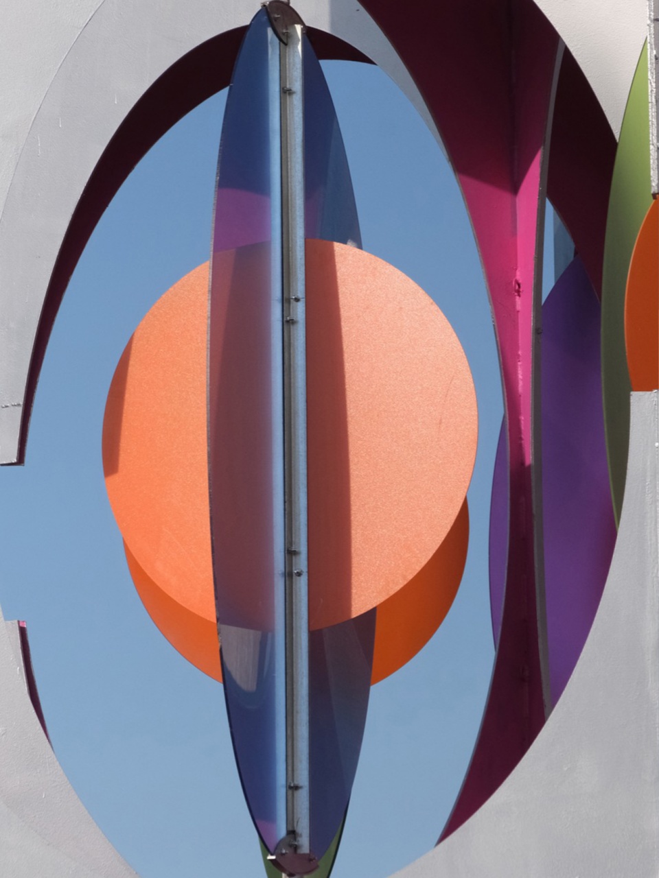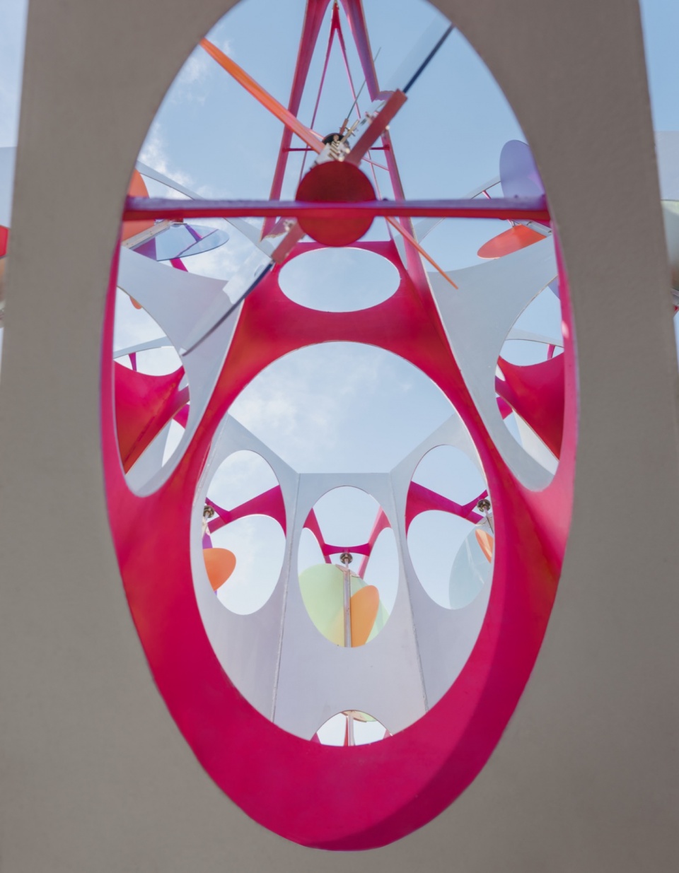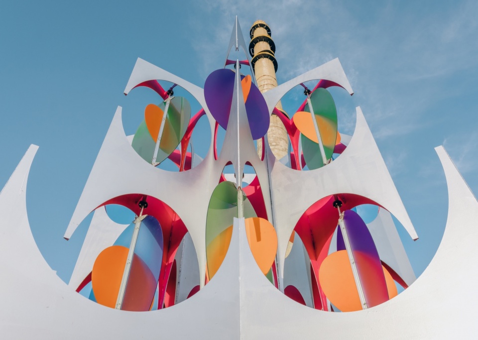 风,是这场视觉韵律的隐形指挥家。装置上方的彩色叶片,像是被自然注入灵魂的活页。它们在气流中自在旋转,时而重叠,时而疏离。半透明的材质,让色彩在交错中混合、在运动中渐变——那是风在空间中留下的彩色轨迹。