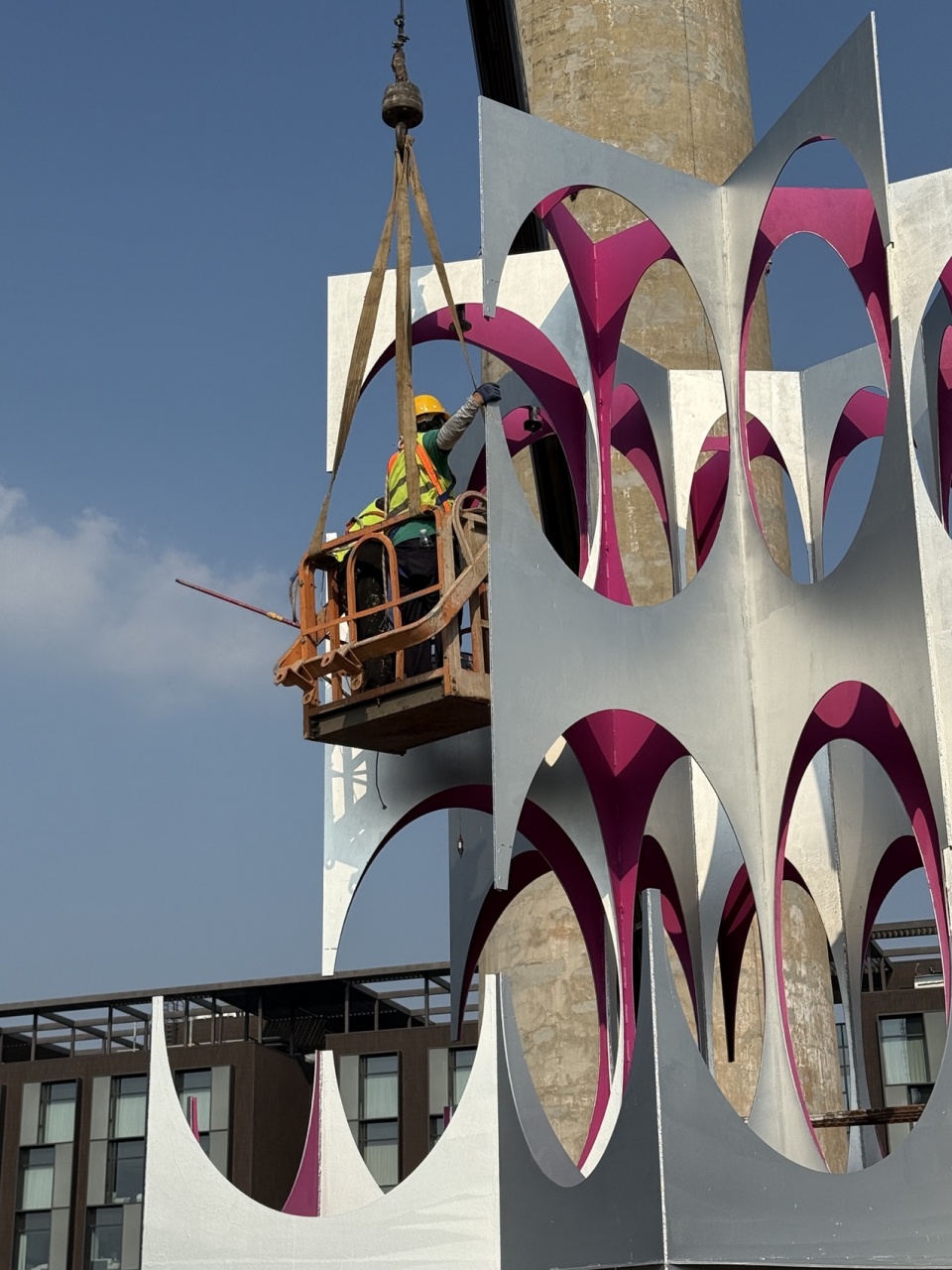 项目后期,我们在现场驻留了很长时间。每天面对那些巨大的黑色构筑物,更渴望在其中融入一些轻盈。装置的金属骨架原本是黑色,但最终我们选择银色和背面的桃色——这也是对首钢园的再次回应,我们希望它更轻灵一些。