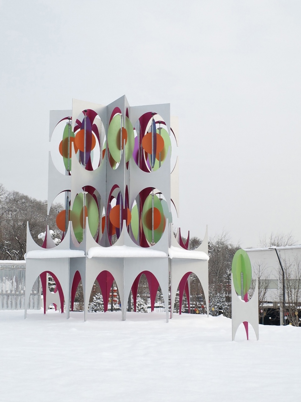 When sunlight passes through the rotating discs, drifting patches of colored light scatter across the ground, drawing visitors into a choreography of light and shadow. As the wind stirs, these shifting hues dance across the space—and moods rise with them. Nature becomes not merely a backdrop, but the very subject of the installation.