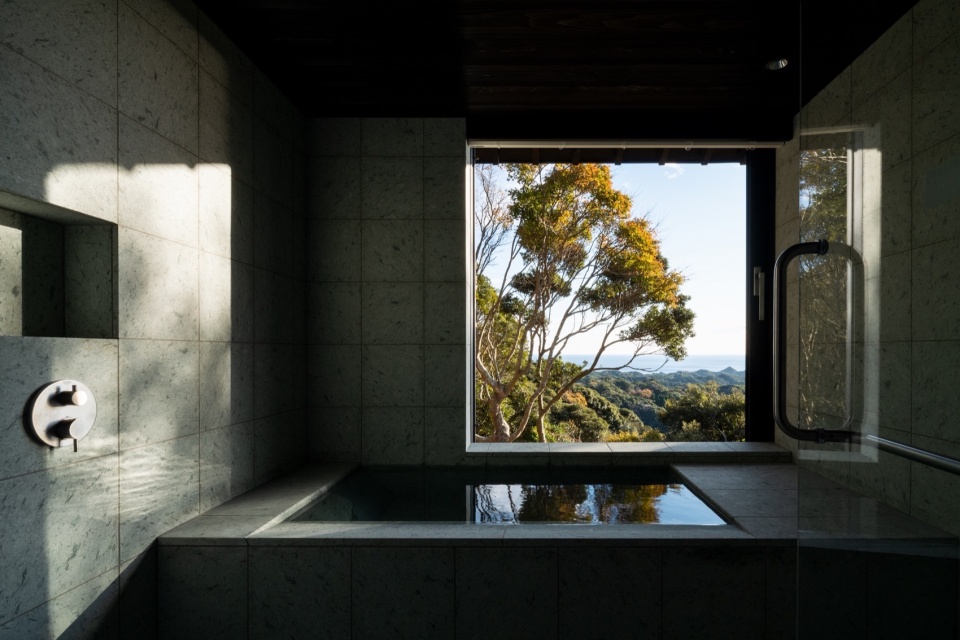 入口大厅采用传统的日本土墙,墙面使用当地土壤与麻纤维混合制成,手工刮擦呈现出粗糙的触感表面。在浴室中,使用了来自日本北部的十和田石;湿润时其表面呈深蓝色,静静地通过日常使用记录水、光和时间。