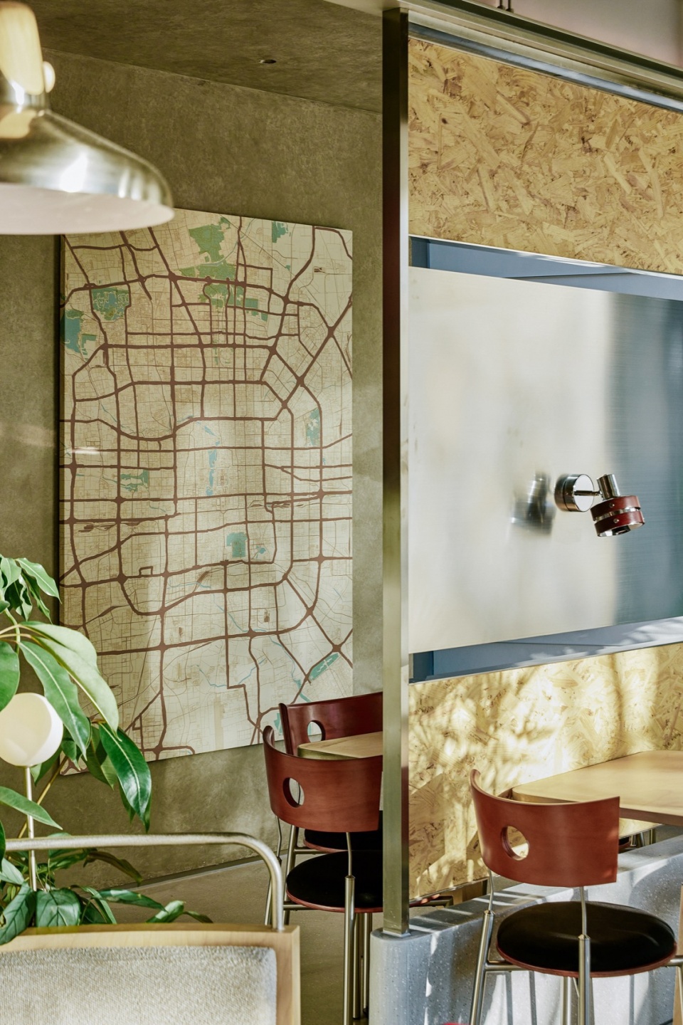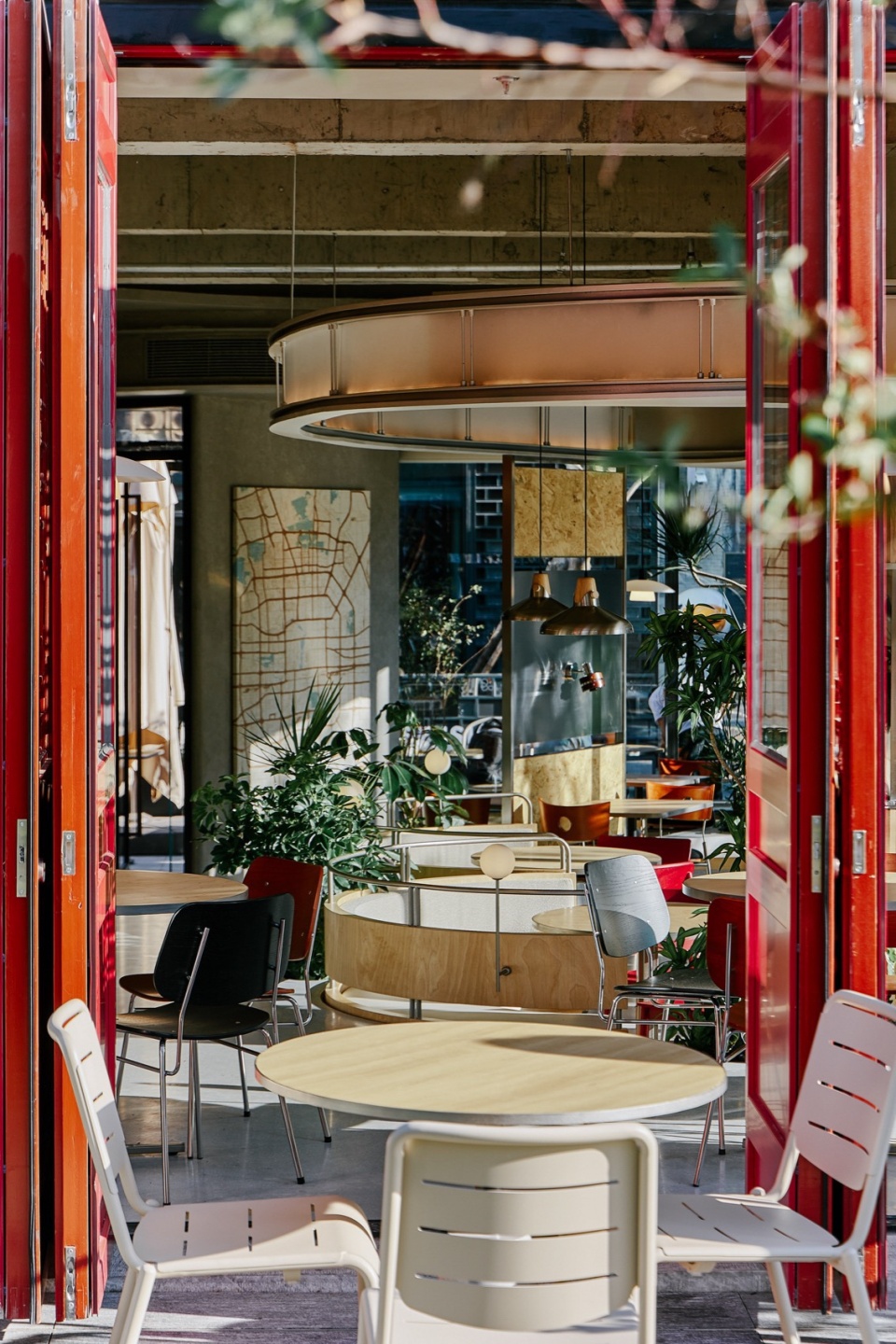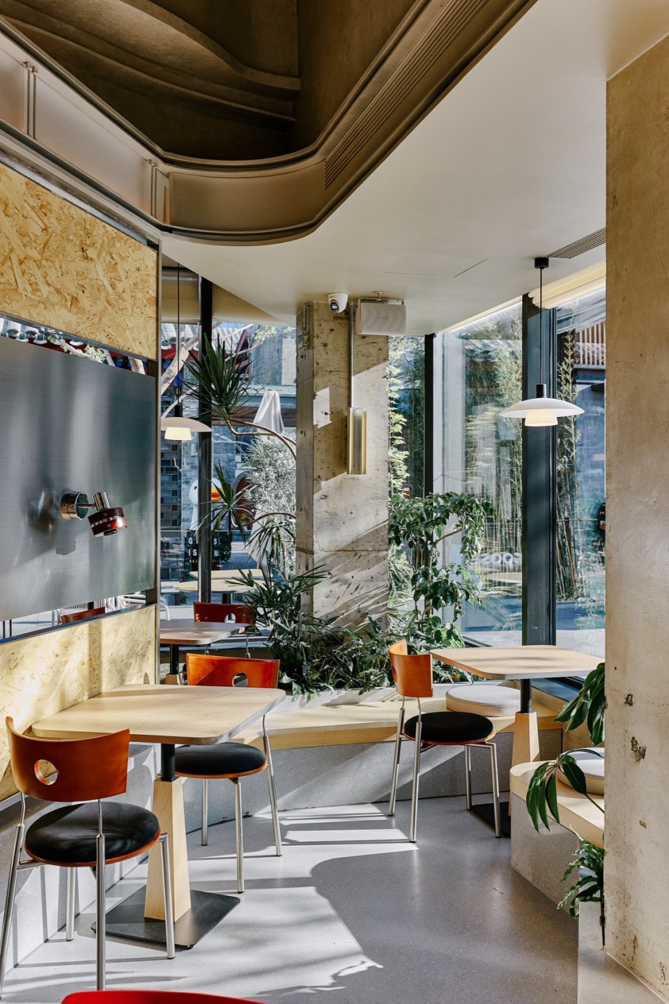 室内桌椅布局延续外摆区域,丰富多样。结合内渗的自然采光和景观绿植的搭配布置,将室内空间“庭院化”,弱化内外边界。