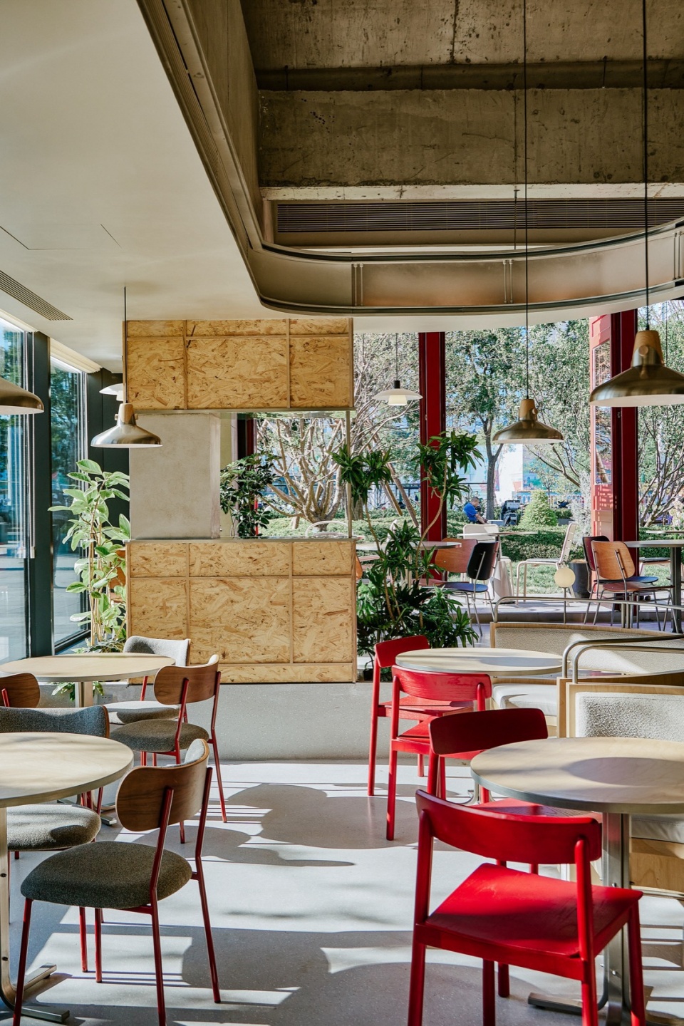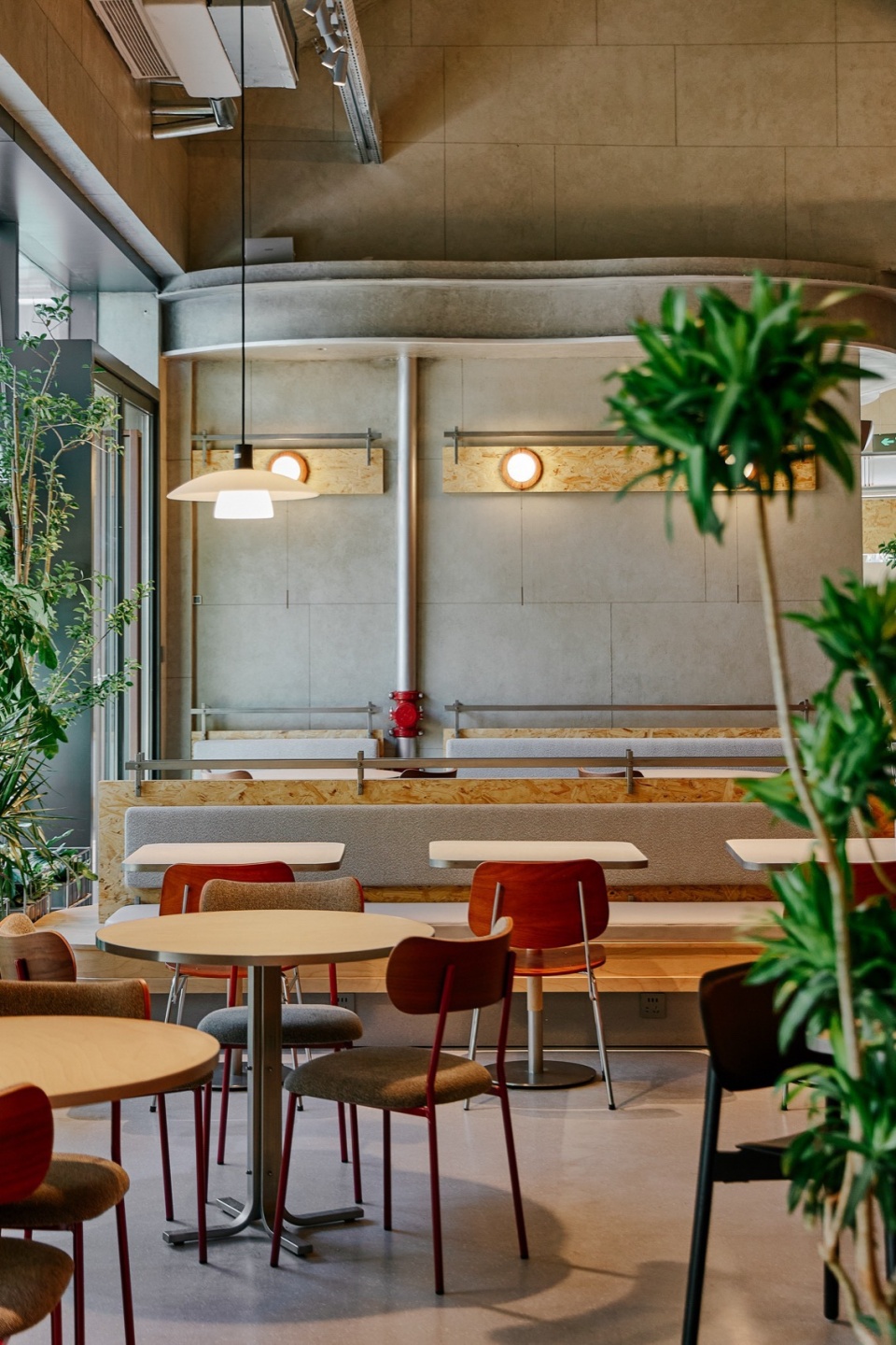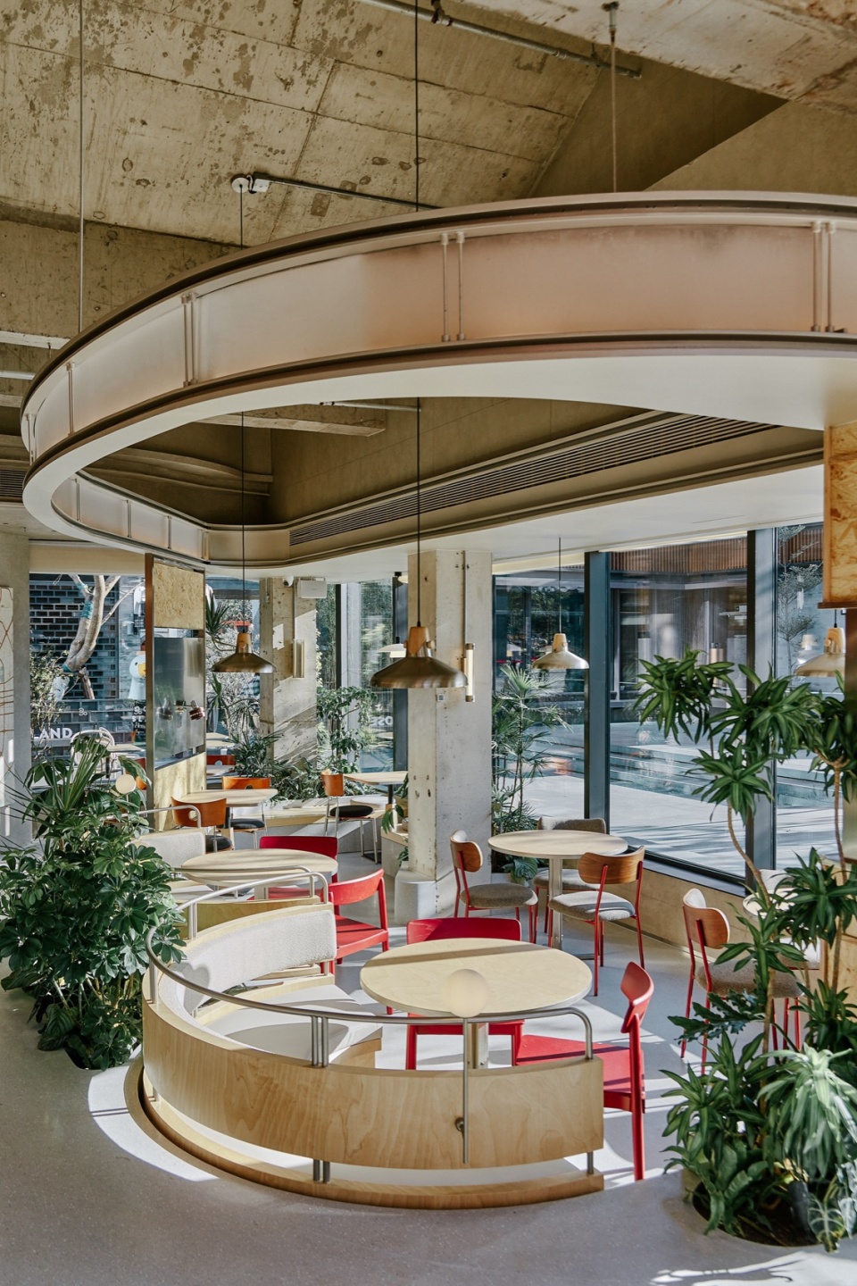 室内桌椅布局延续外摆区域,丰富多样。结合内渗的自然采光和景观绿植的搭配布置,将室内空间“庭院化”,弱化内外边界。