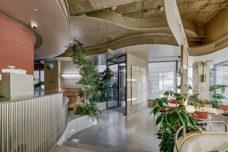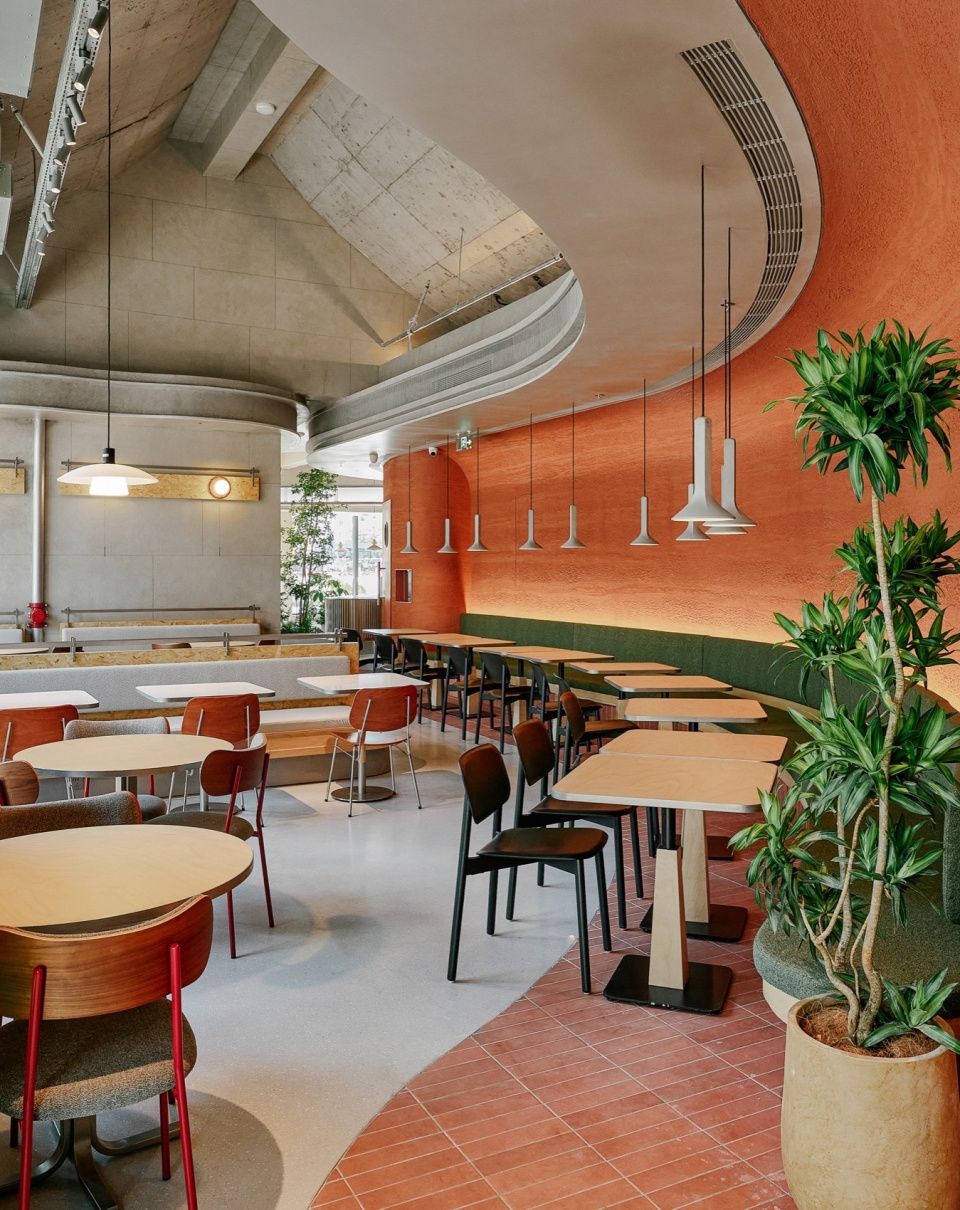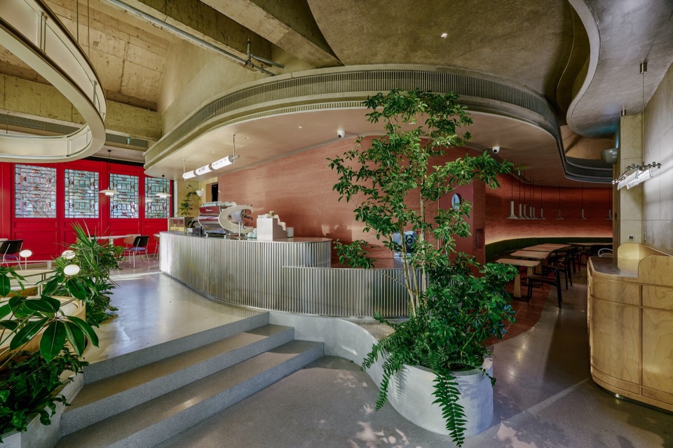餐厅室内用曲线划分布局,弱化边界和空间棱角。增强空间灵活度与动态节奏,同时体现了品牌的商业气质和受众画像。