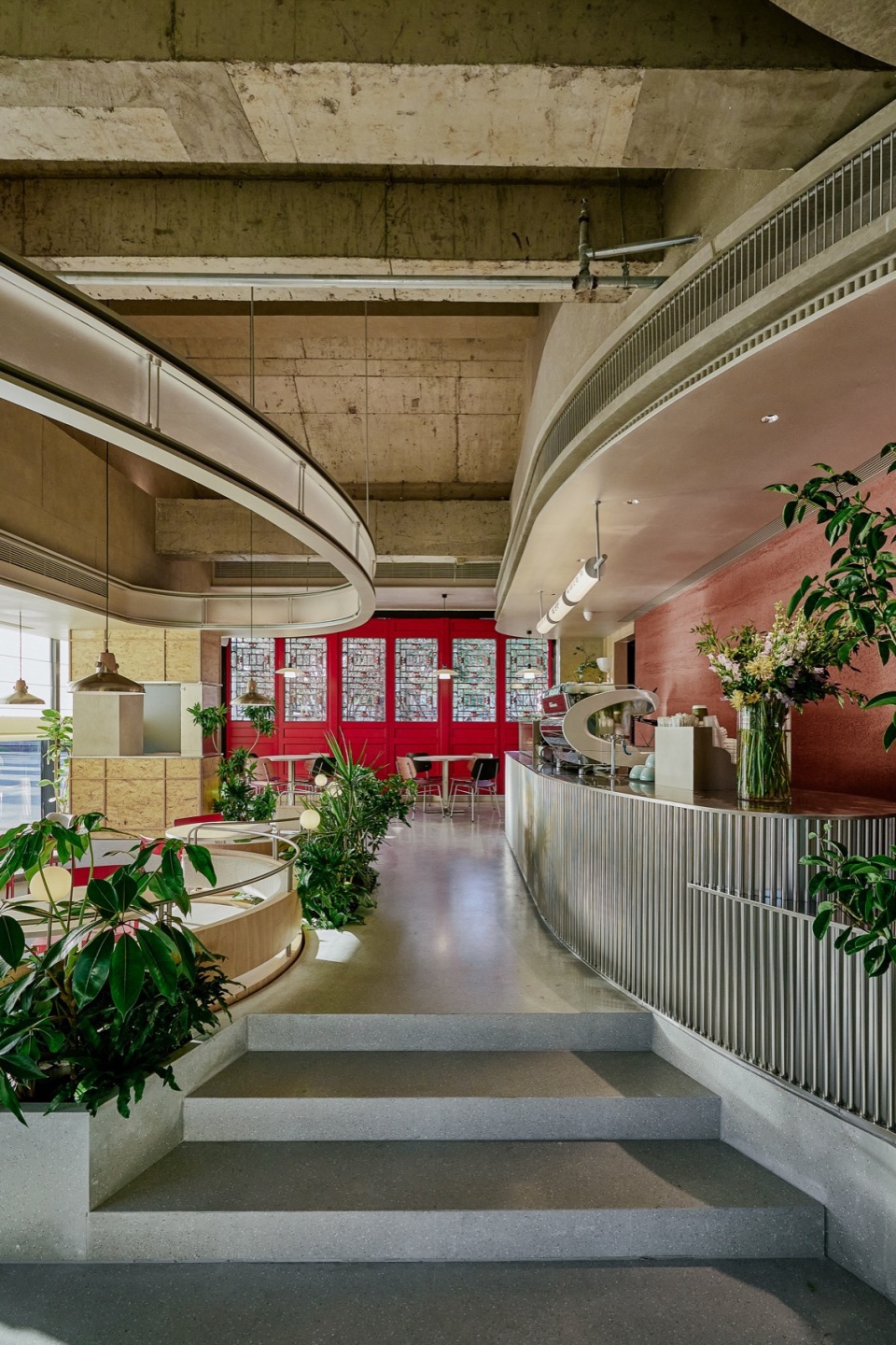 Taking advantage of the natural elevation changes in the terrain, we partially raised the floor level on the west side of the restaurant to create a spatial experience with varied heights. The ceiling design echoes the curved layout, with arched cantilevers guiding the eye and establishing an intrinsic connection between the ceiling and the floor; it also discreetly conceals HVAC equipment and ductwork.