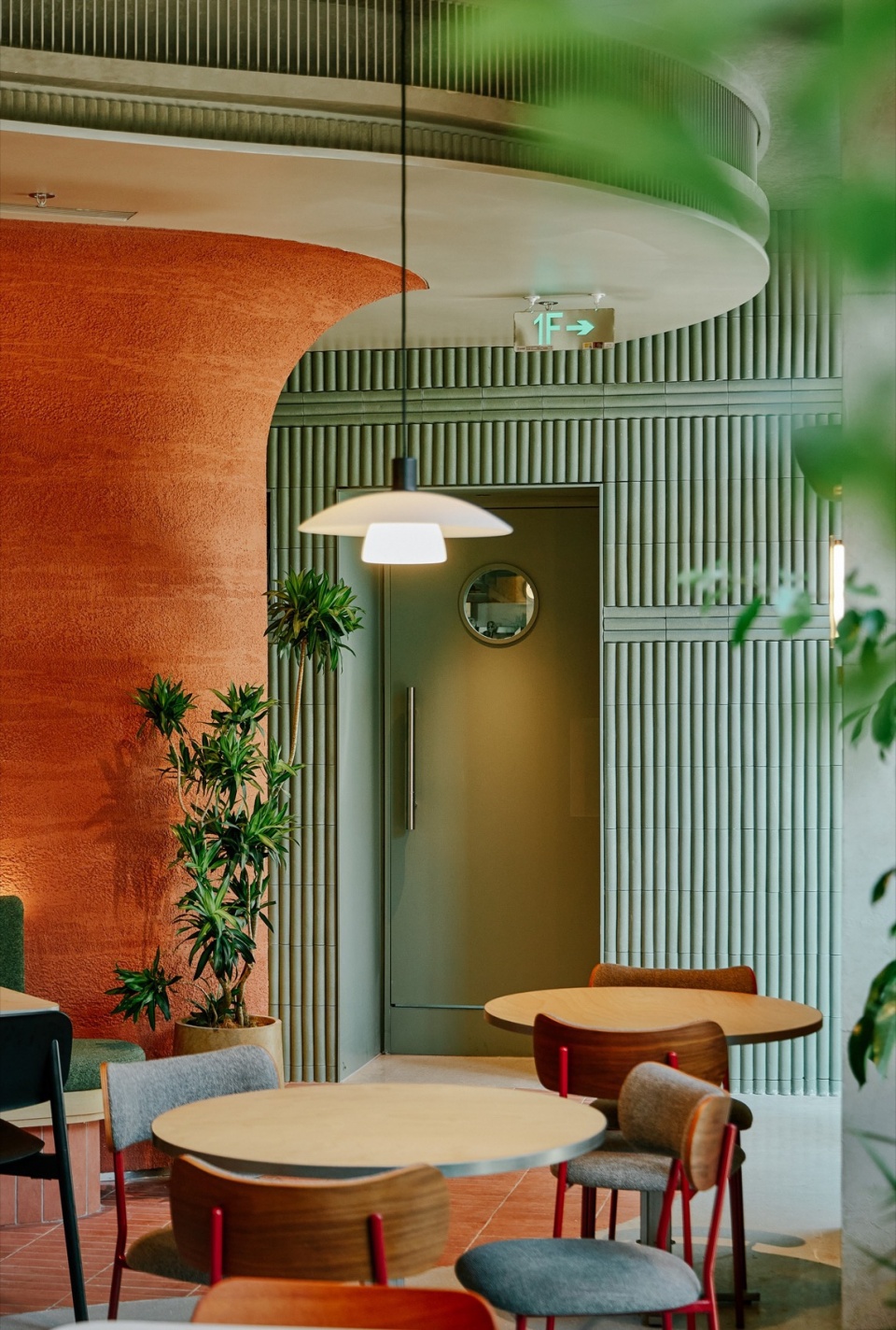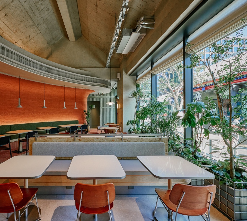 The bar counter and booth seating follow the curved layout, becomes to the major design element that runs throughout the entire restaurant. The curved wall is finished with orange-red rammed earth textured paint, creating a vibrant and welcoming vibe.